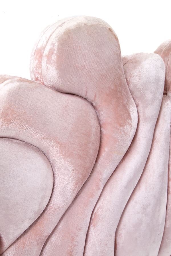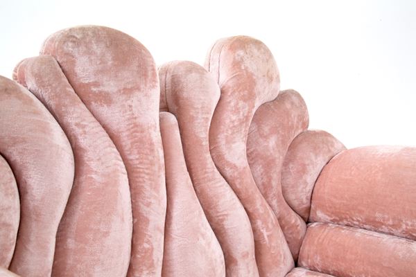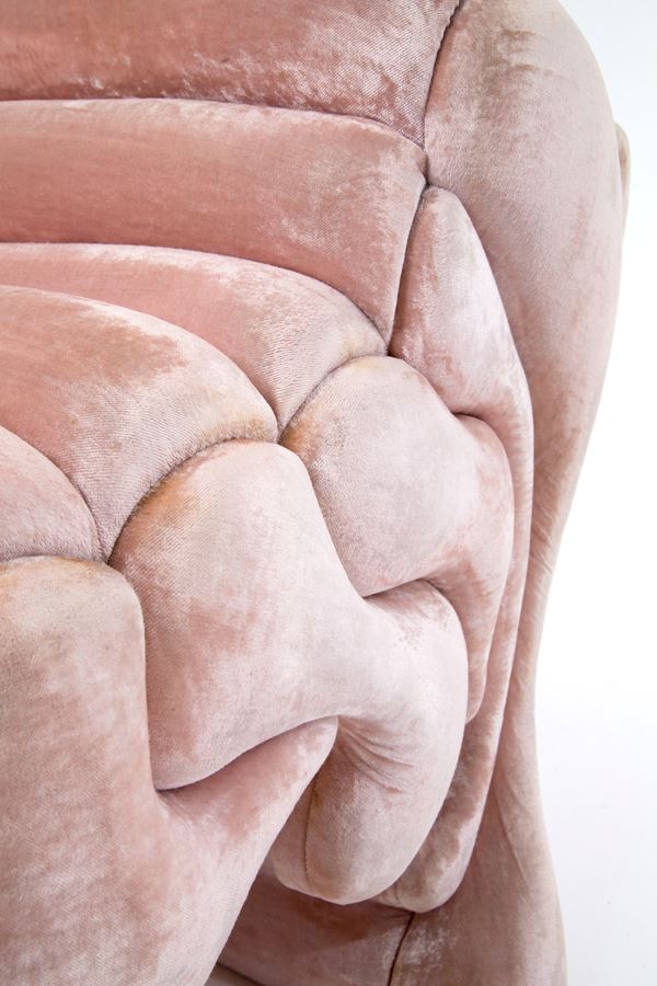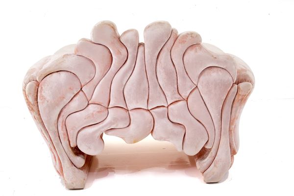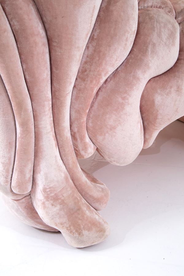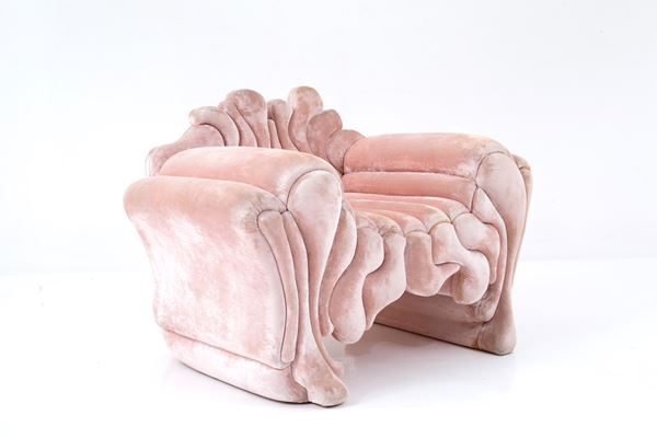 Lavica armchair in pink velvet. Production FORMITALIA. 1991. Published in Massimo Domenicucci and Flavio Mangione (edited by), Futuro Anteriore - Future Perfect, Florence, 2014.