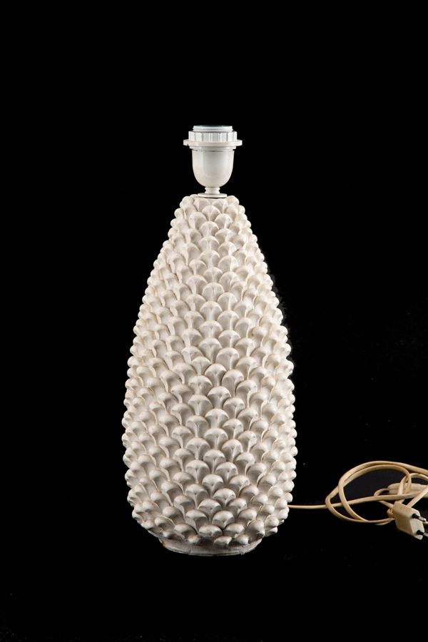 Pine cone shaped ceramic table lamp with fabric lampshade.