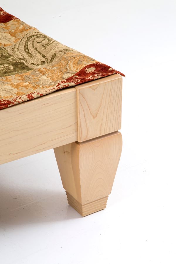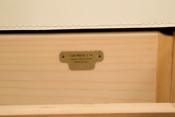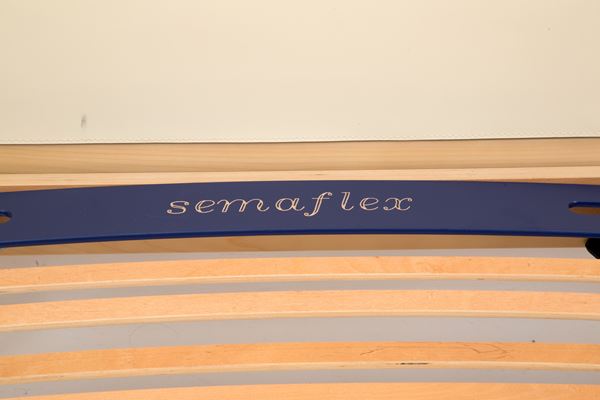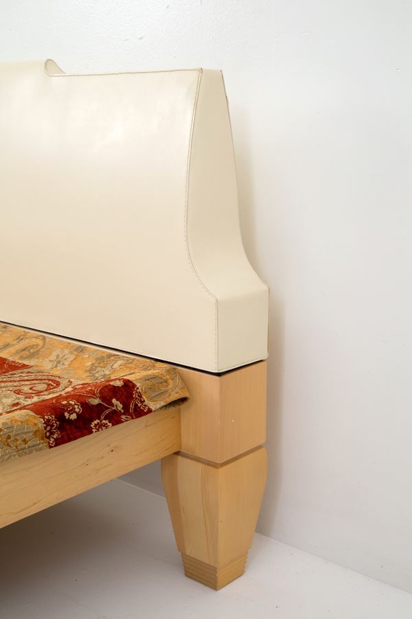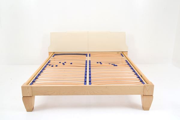 Double bed in wood and leather headboard. Made by GIORGETTI. Manufacturer's label on the headboard. 1990s.