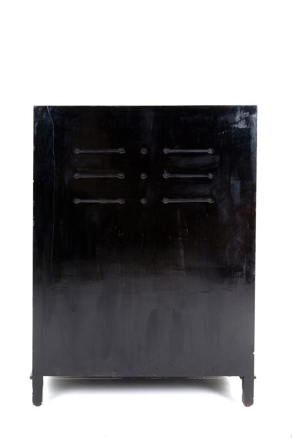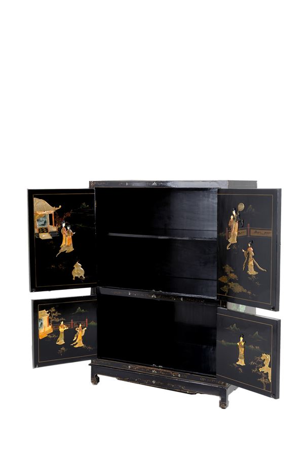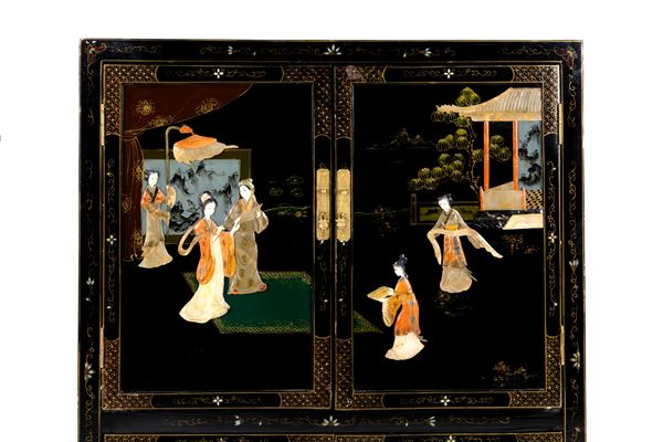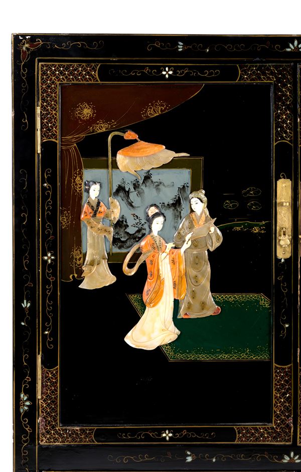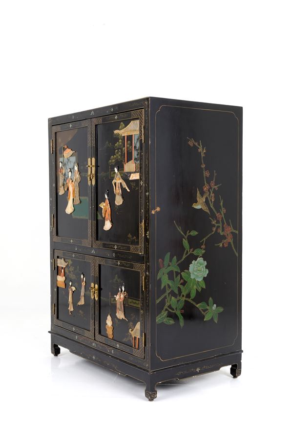 Black lacquered four-door cabinet with semiprecious stones depicting scenes of oriental life. China. Minor defects.