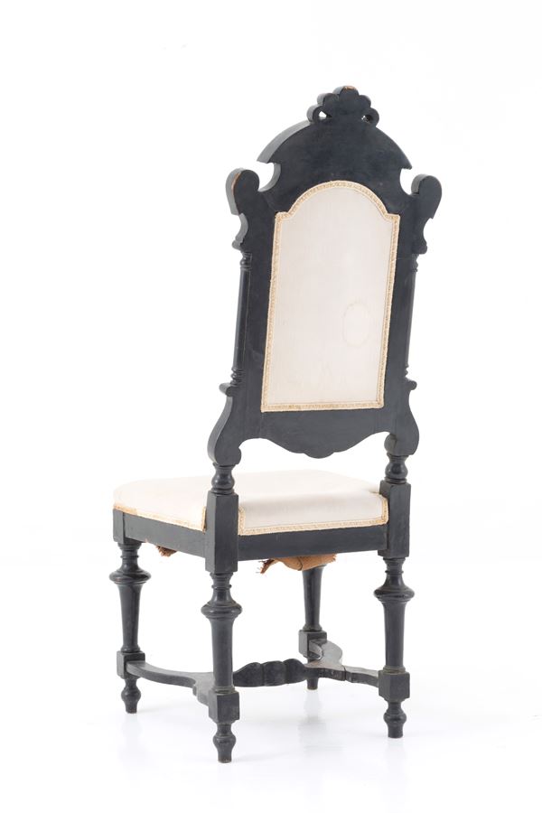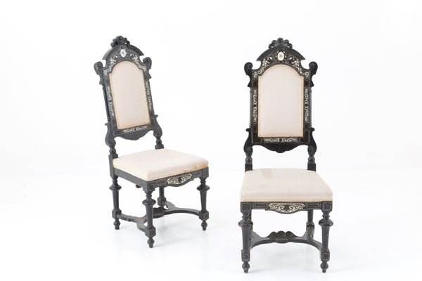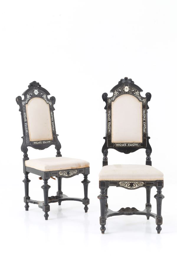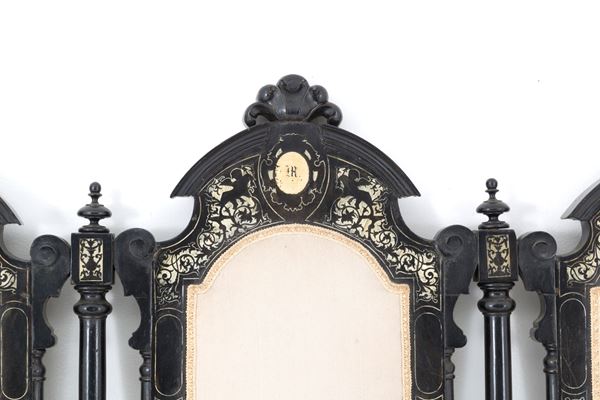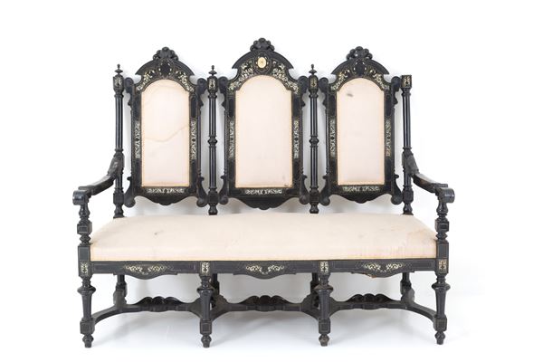 Sofa and six chairs in ebonized and inlaid wood with legs joined by a crosspiece and inlaid top. 19th century. Defects and missing parts.