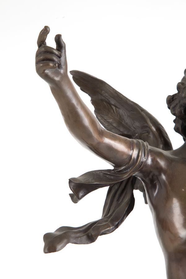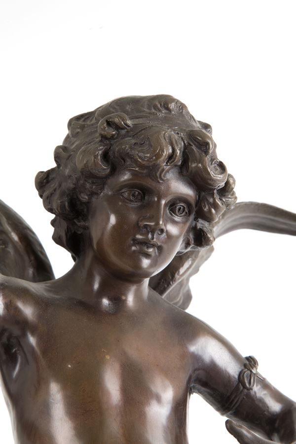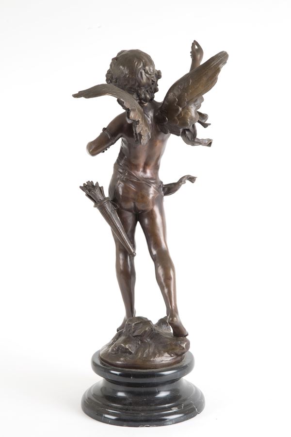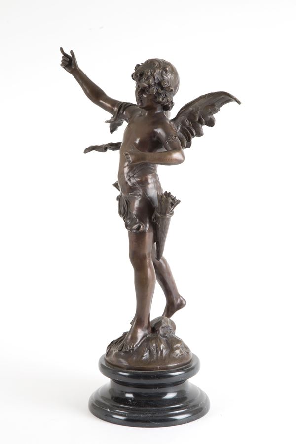 Bronze sculpture depicting "CUPID" on a marble base. Signed on the base.