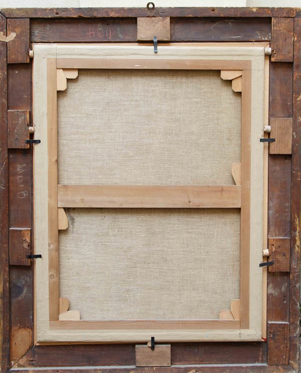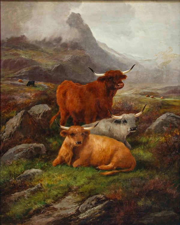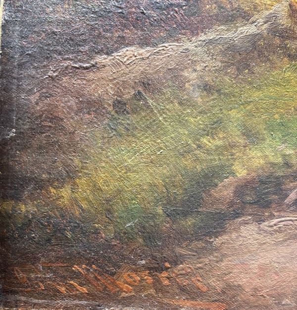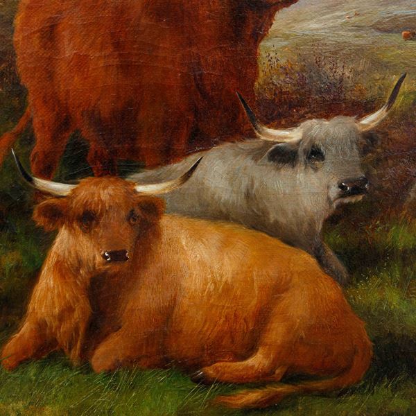 Oil painting on canvas depicting "COWS IN A PASTURE". Signed lower left. In a gilded frame. Restorations. Already relined and re-stretched.