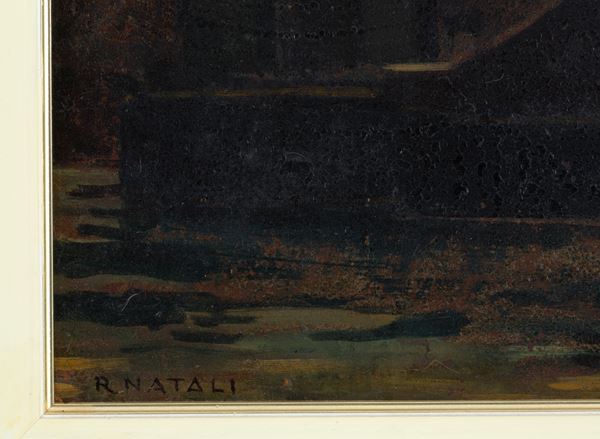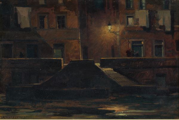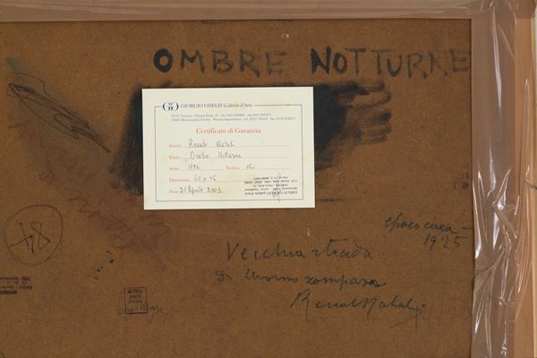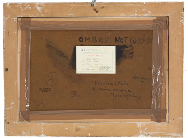 Oil painting on masonite titled "NIGHT SHADOWS". Signed lower left. Countersigned, titled and with a certificate of guarantee from the Giorgio Ghelfi Gallery on the back. Framed. Defects. With a certificate of authenticity on a photograph by Giorgio Ghelfi.
