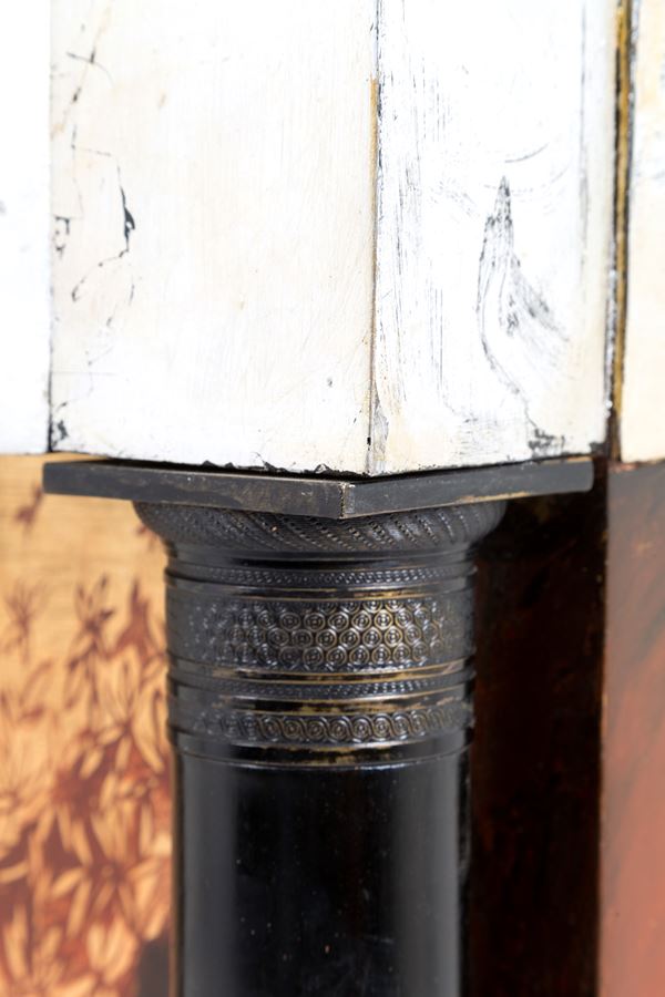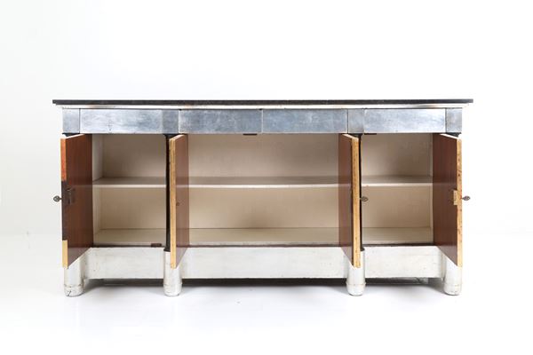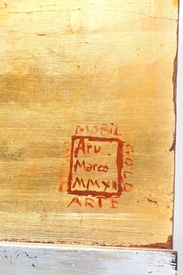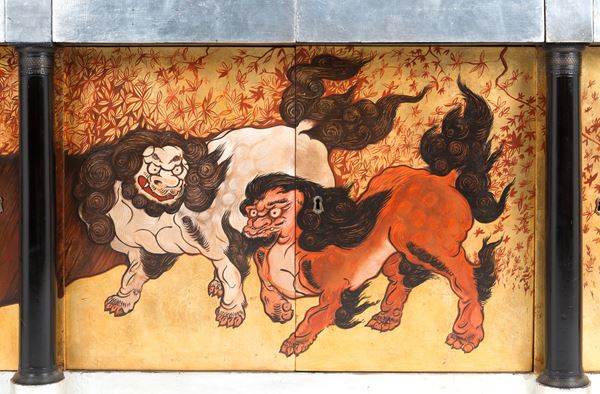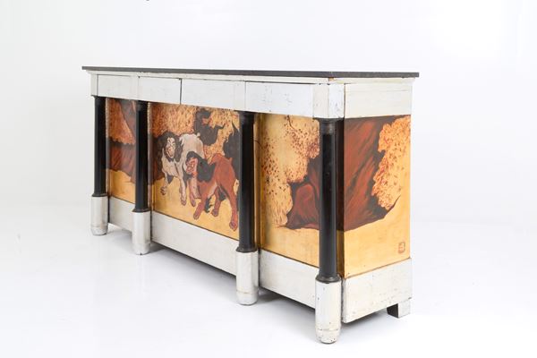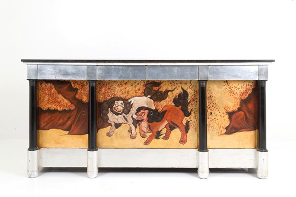 Sideboard with four doors and four drawers painted with pho dogs on a gold background. Signed ARU MARCO and dated 2012 on the side. Minor defects.
