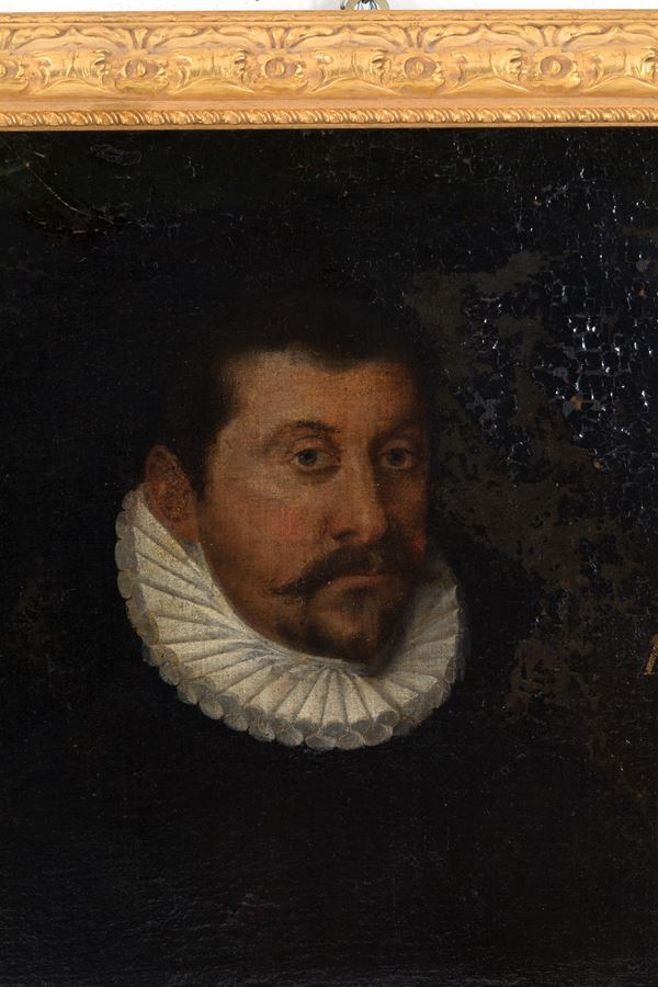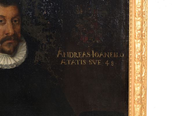 Oil painting on canvas depicting "ANDREAS IOANELLO". Dated 1590 top right. In a non-contemporary carved and gilded wooden frame. Defects and restorations. Already relined and re-stretched.