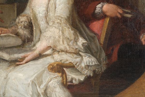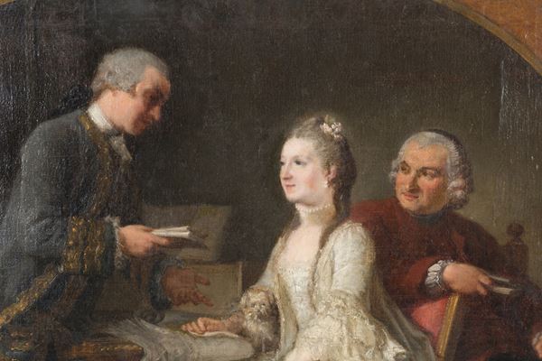 Oil painting on canvas depicting "COURT SCENE". 18th century. Restoration. Already relined and re-stretched.