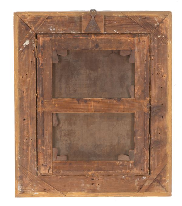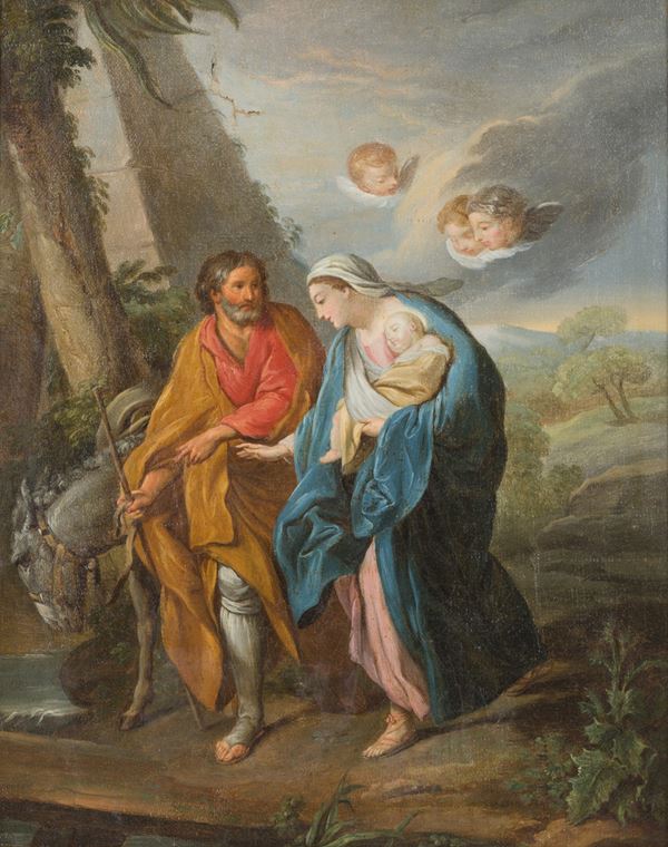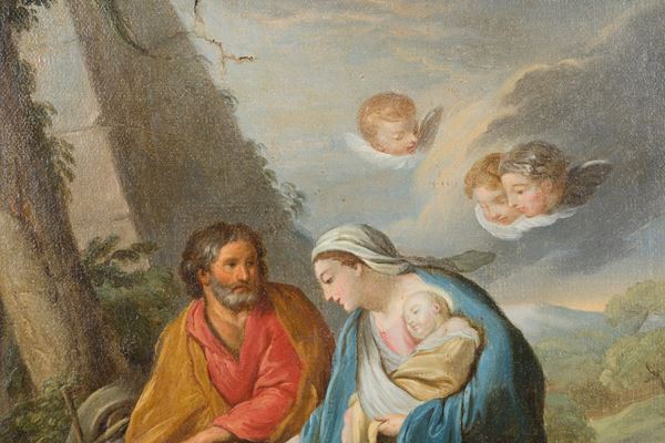 Oil painting on canvas depicting "FLIGHT INTO EGYPT". 18th century. In a gilded frame. Restoration.
