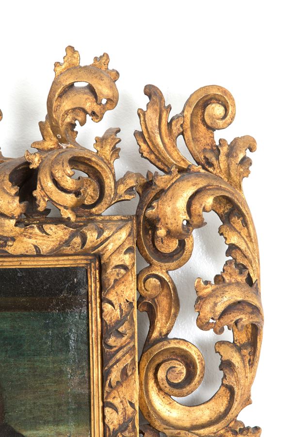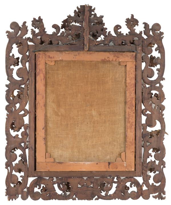 Oil painting on canvas depicting "HOLY FAMILY WITH SAINT JOHN". XVII century. In carved and gilded wooden frame. Restoration. Already relined and re-stretched.