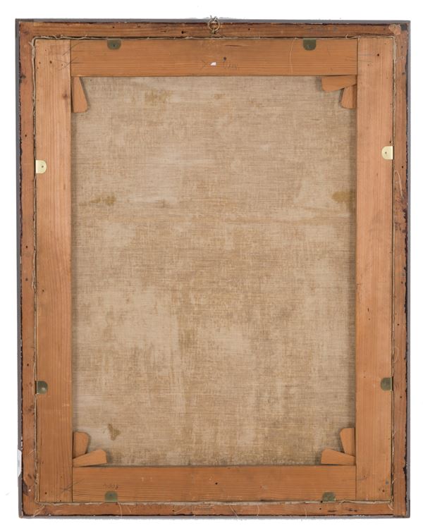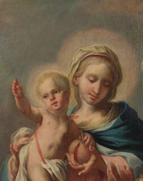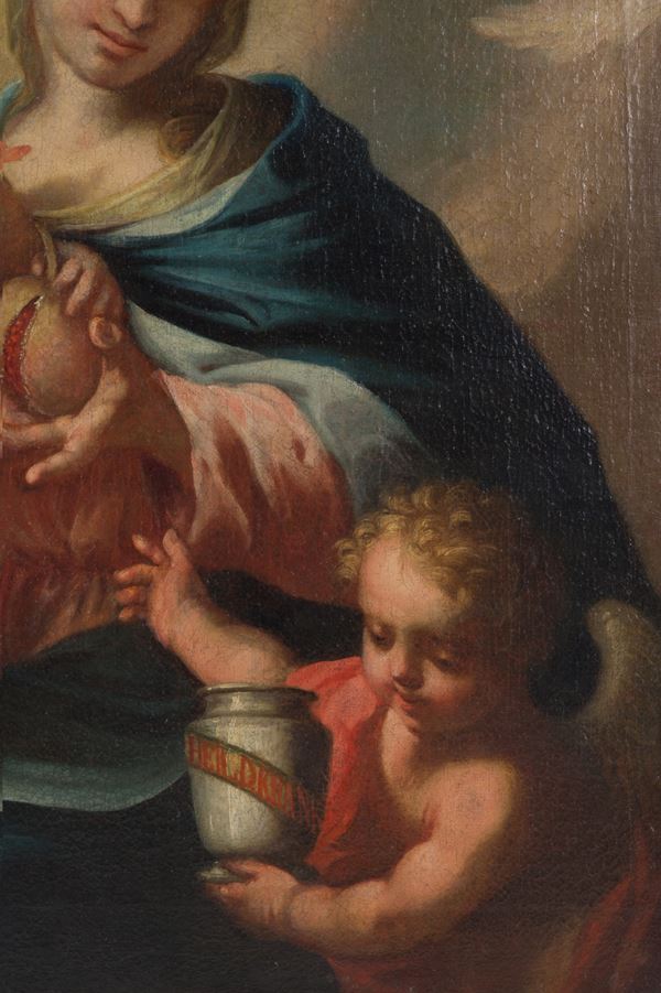 Oil painting on canvas depicting "MADONNA OF THE POMEGRANATE". 18th century. Framed. Restorations. Already relined and re-stretched.