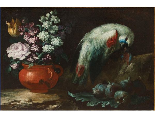 ROMAN SCHOOL OF THE 17TH CENTURY. Oil painting on canvas depicting "STILL LIFE WITH PARROT". In carved and gilded frame. Minor restorations. Already relined and re-stretched.