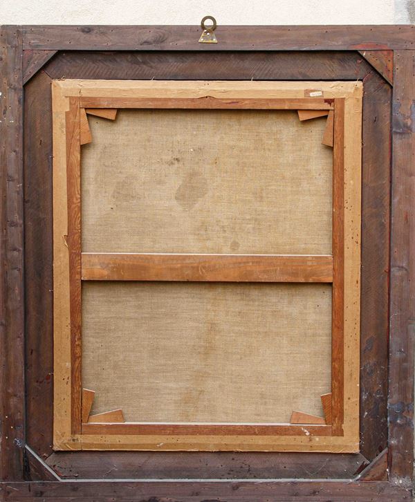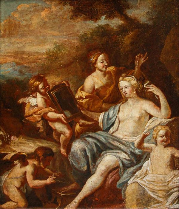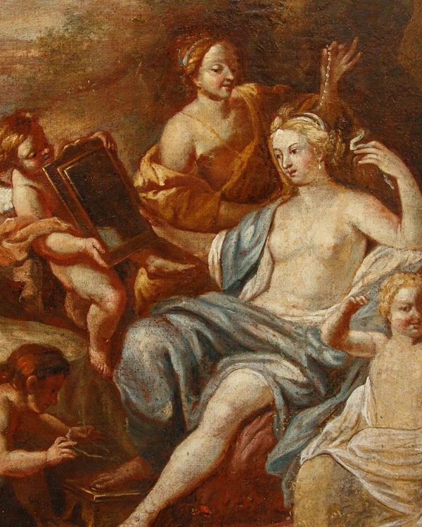 Oil painting on canvas depicting "VENUS WITH A MIRROR". 18th century. In a non-contemporary carved, perforated, gilded and mecca frame. Restoration. Already relined and re-stretched.