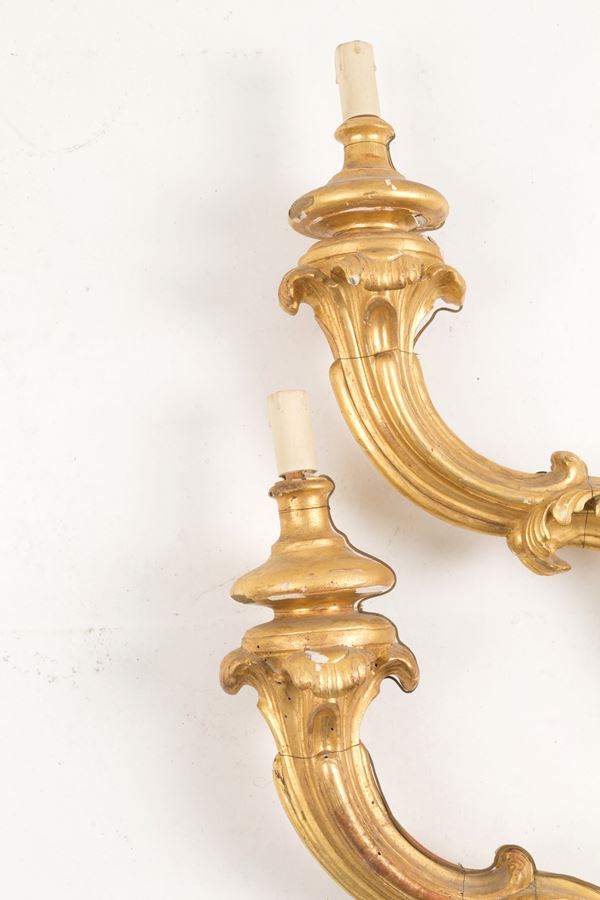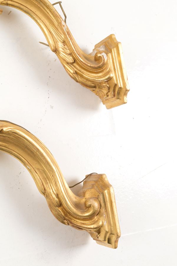 Pair of carved and gilded wooden arms. 18th century. Defects and shortcomings.
