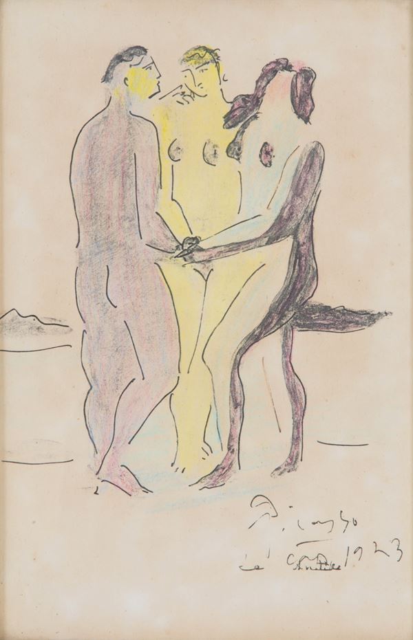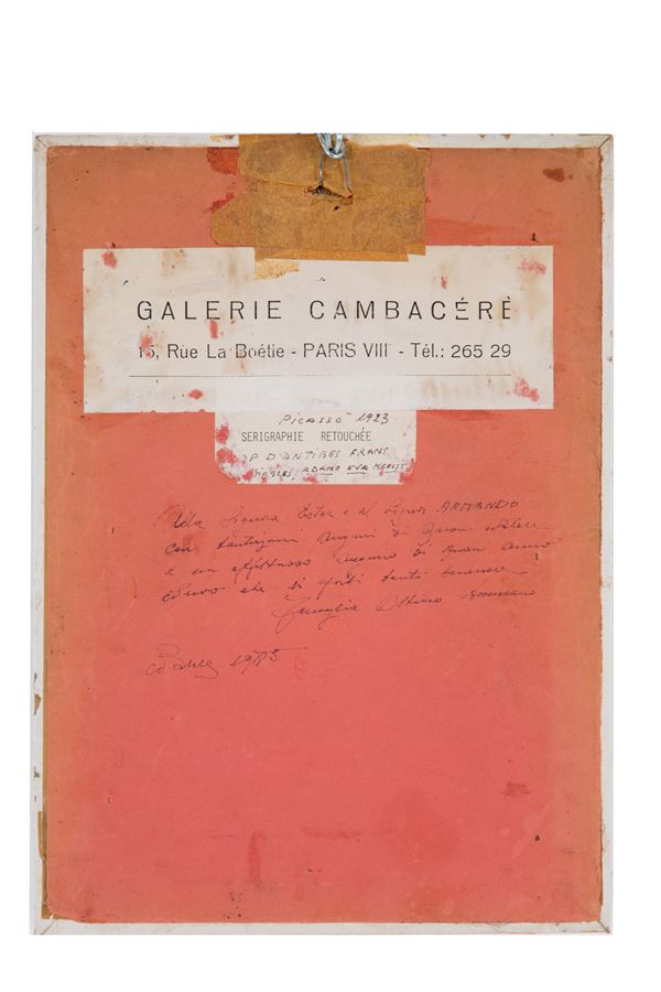 Retouched serigraphy on paper depicting "ADAM, EVE AND THE DEVIL". Signed and dated 1923 lower right. Framed. With cartouche of Galerie Cambacérè, Paris on the back.