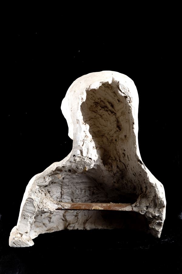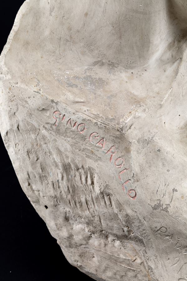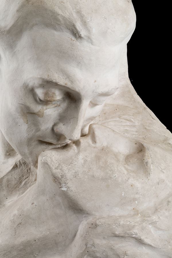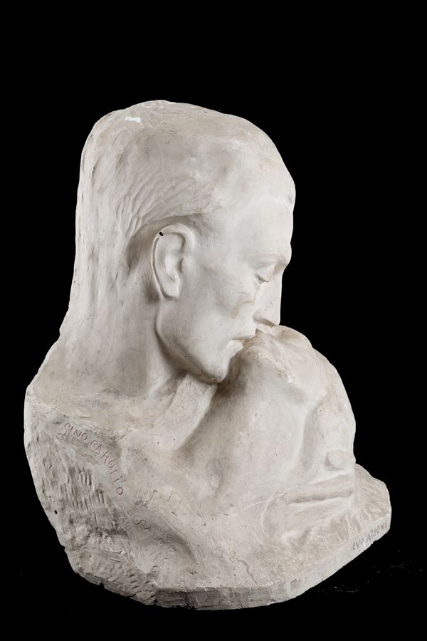 Plaster sculpture depicting "KISS". Titled "EVOCATION". Signed GINO CAROLLO, PADOVA on the right shoulder. 20th century. Minor defects.