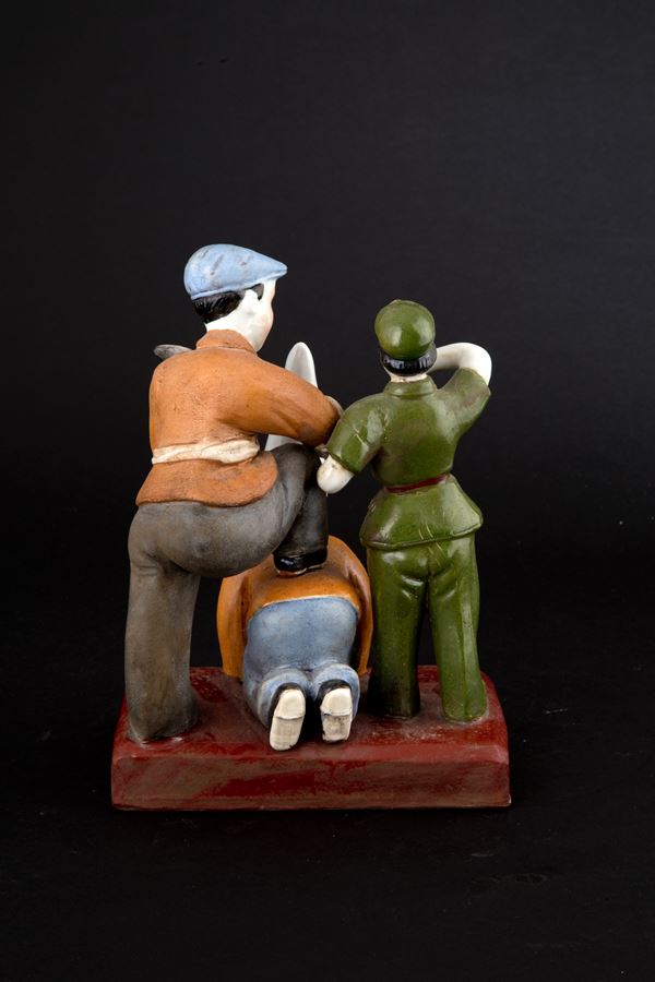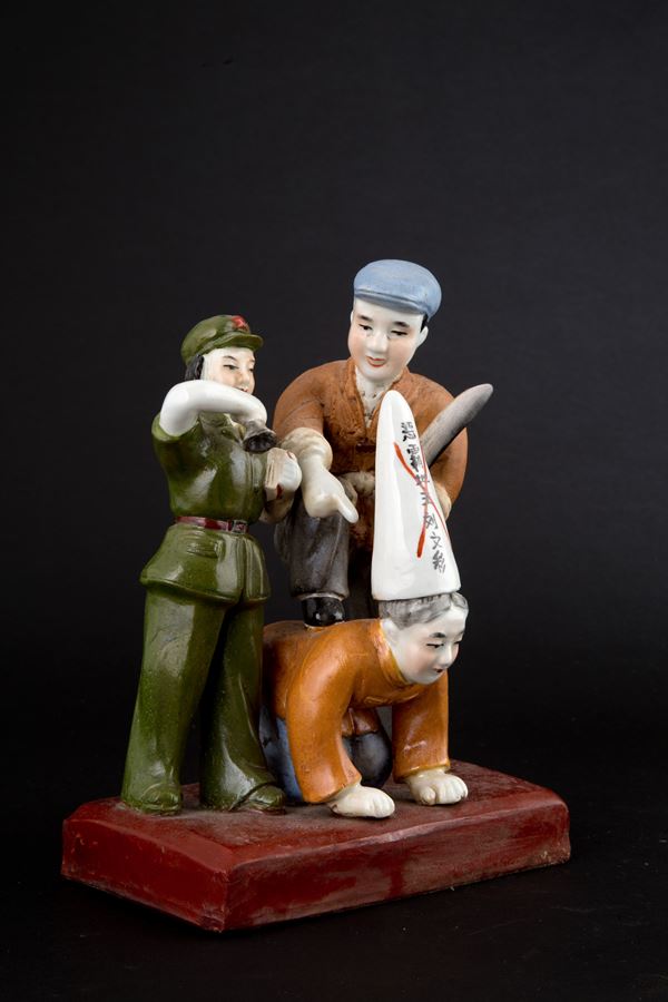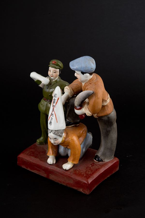 Polychrome porcelain group depicting "THE EVIL MASTER". China. Cultural Revolution period. Defects.