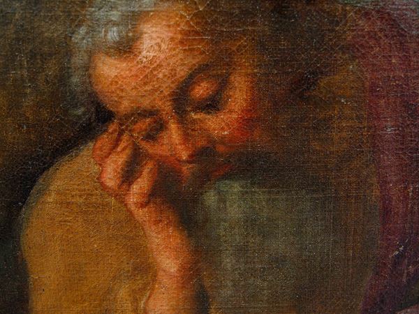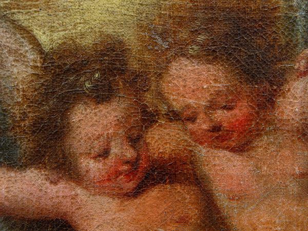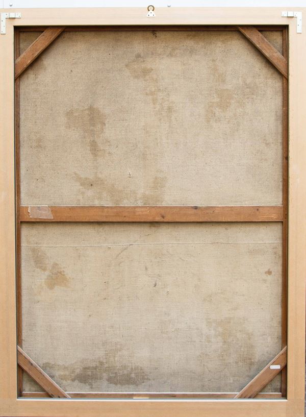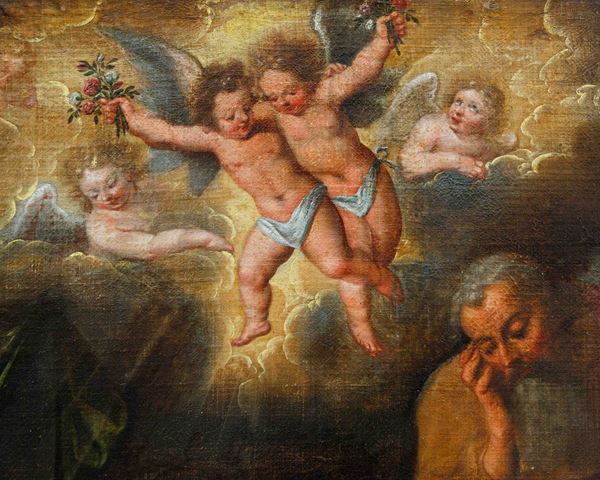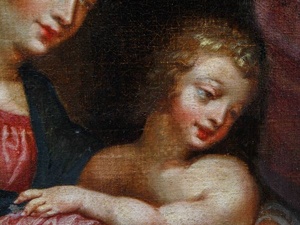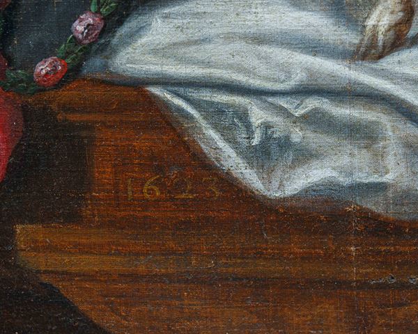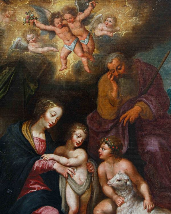 Oil painting on canvas depicting "HOLY FAMILY WITH SAINT JOHN". Dated 1623 at the bottom. Framed. Defects and restorations. Already relined and re-stretched.