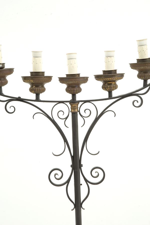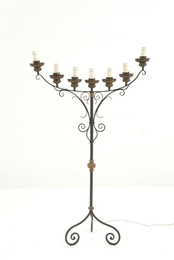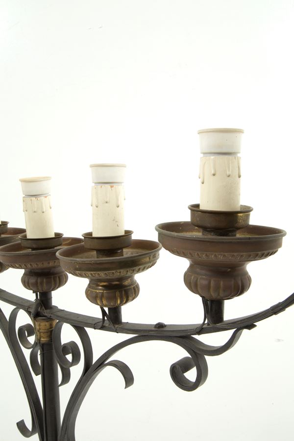 Seven-light candelabra in wrought iron and gilded bronze sheet metal. 20th century. Minor defects.