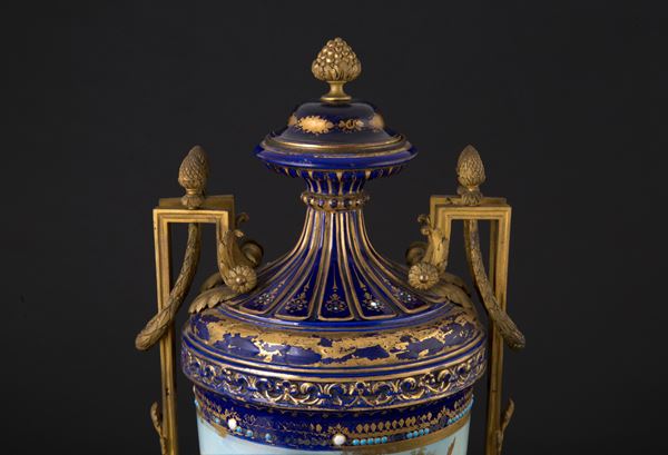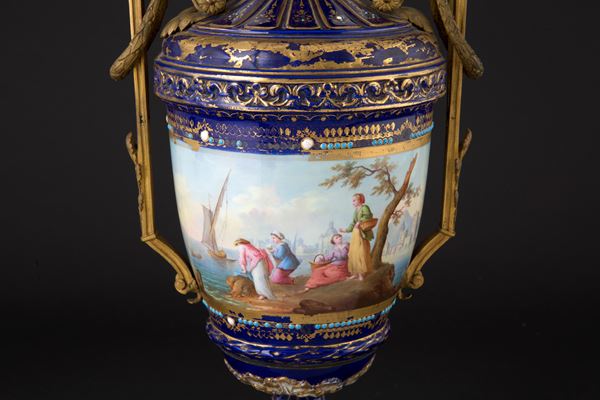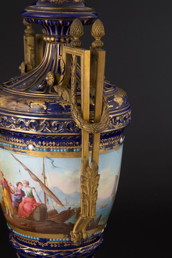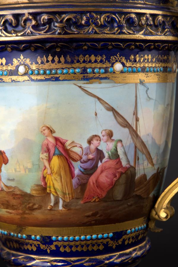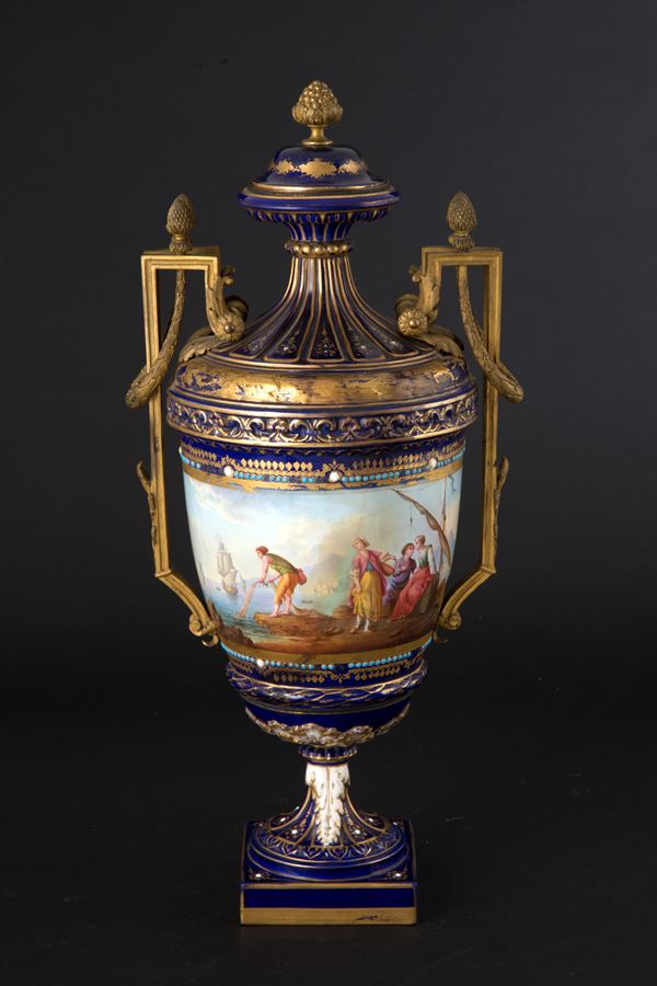 Sèvres porcelain vase painted depicting "SEA LANDSCAPE AND FIGURES" with bronze finishes. Mark on the bottom. Defects and missing parts.
