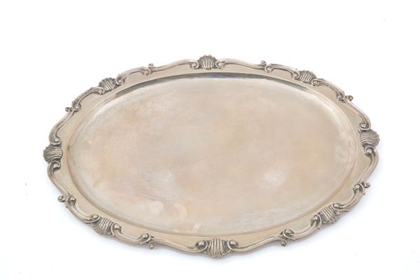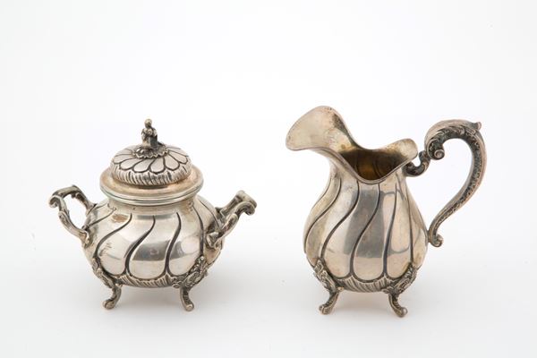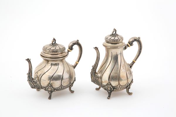Coffee service in embossed and chiselled 800 silver consisting of tray, coffee pot, teapot, milk jug and sugar bowl, approx. 3000 gr. total. Early 20th century.