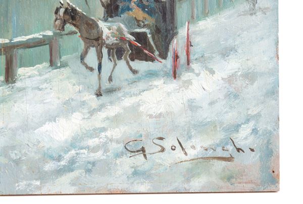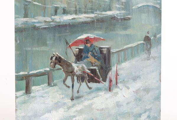 Oil painting on panel depicting "SNOWY NAVIGLIO WITH CARRIAGE". Signed at the bottom.