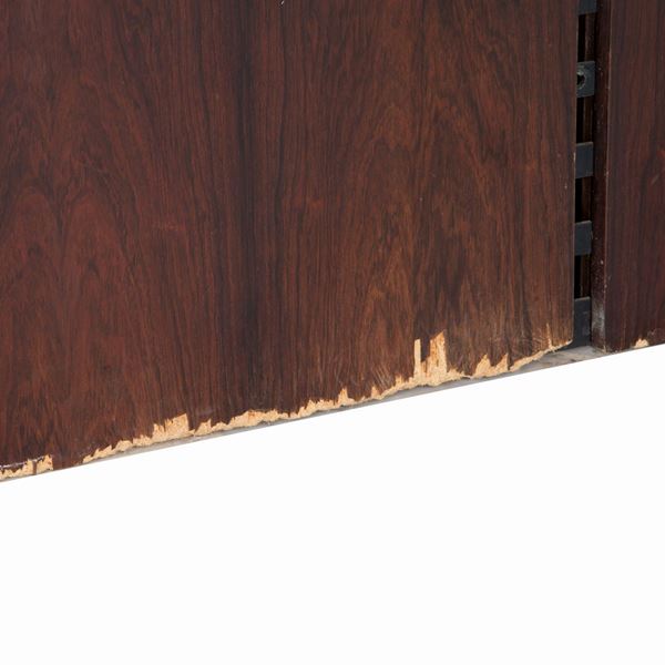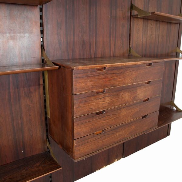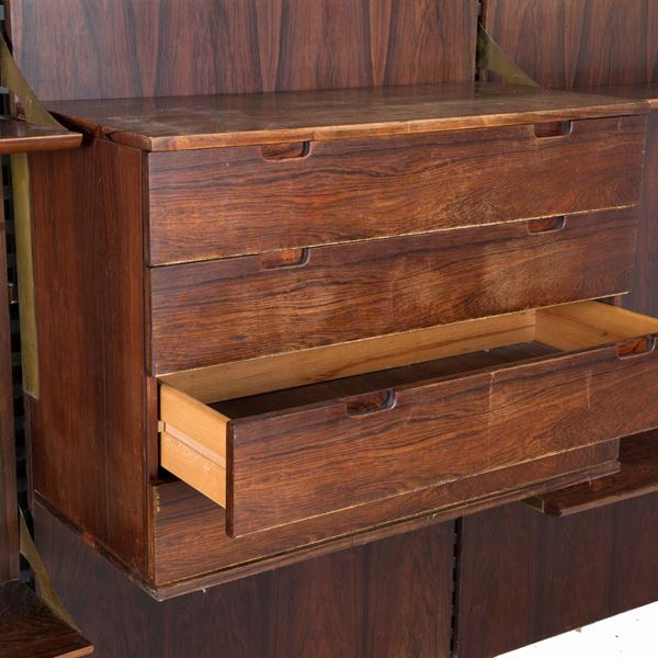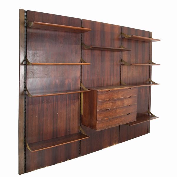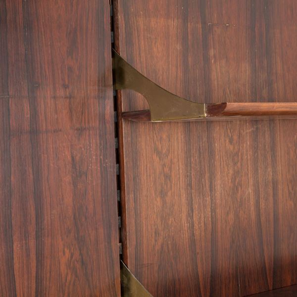 Three-element bookcase veneered in fine wood with iron supports, veneered wood and brass shelves with hanging chest of drawers. 1950s. Signs of wear and tear.