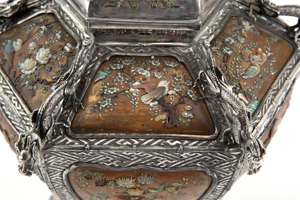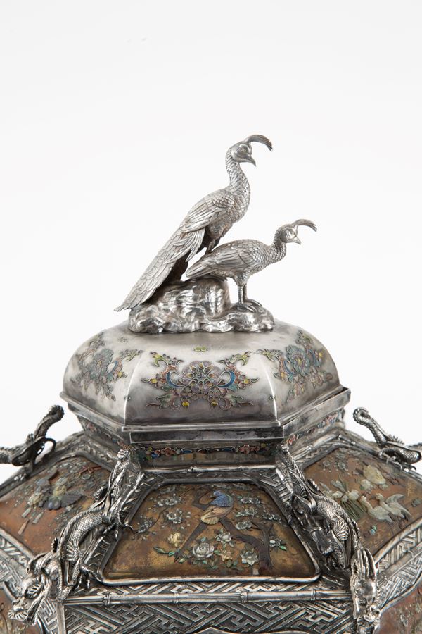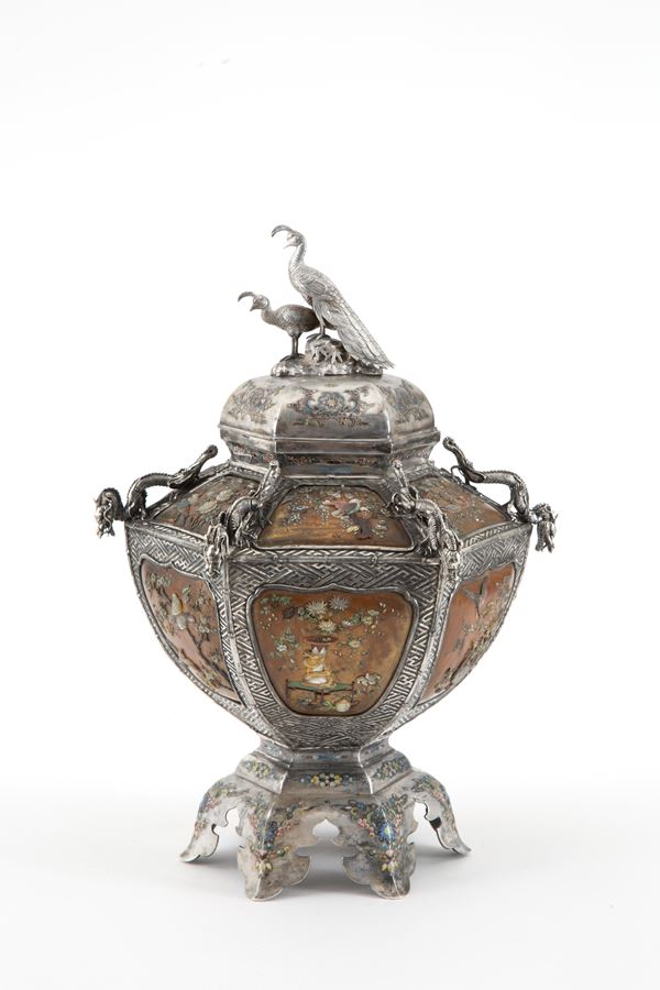 Shibayama vase in finely embossed and chiselled silver with dragons and peacocks. With reserves with mother-of-pearl applications depicting floral and bird subjects. Japan. 19th century. Slight deficiencies.