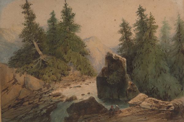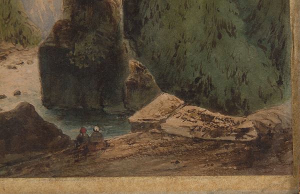 Watercolor on cardboard mounted on cardboard depicting "MOUNTAIN LANDSCAPE WITH FIGURES". Signed J. LANGUSTIN and dated 1857 lower right. In a gilded wooden frame.