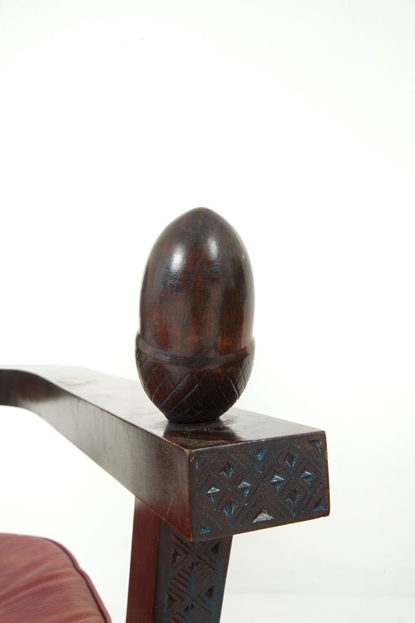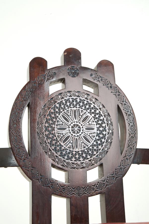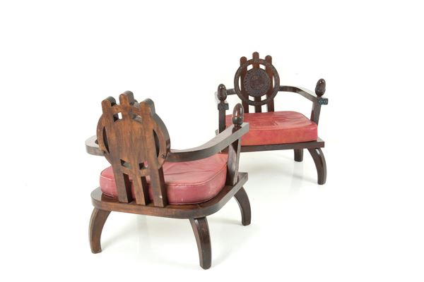 Two wooden armchairs with a circular, perforated and carved backrest and leather cushions. Signs of wear and tear.