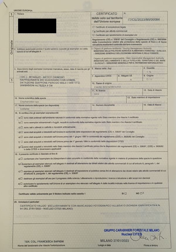 Ivory okimono depicting "GUARDIAN GOD WITH MEN". Japan. 19th century. With CITES certificate.