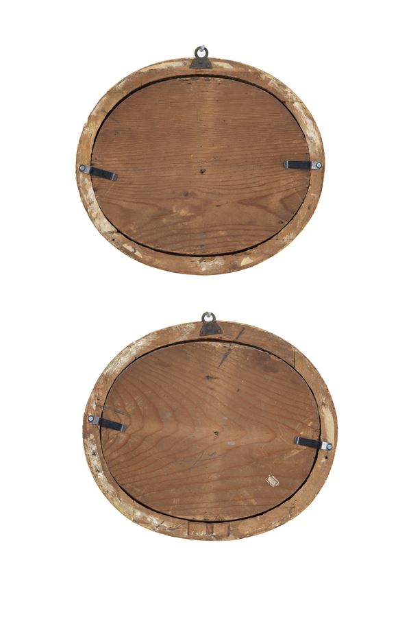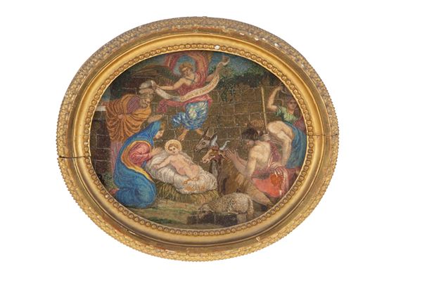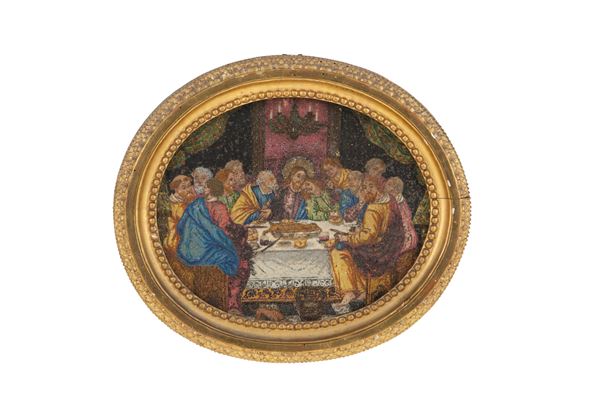 Pair of oval beaded micromosaics depicting "ADORATION OF THE SHEPHERDS" and "THE LAST SUPPER". 19th century. In finely carved and gilded frames. Defects and missing parts.
