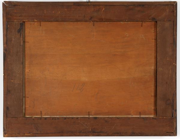 Oil painting on panel depicting "RIVER LANDSCAPE." Signed lower right. Framed in a wooden frame.