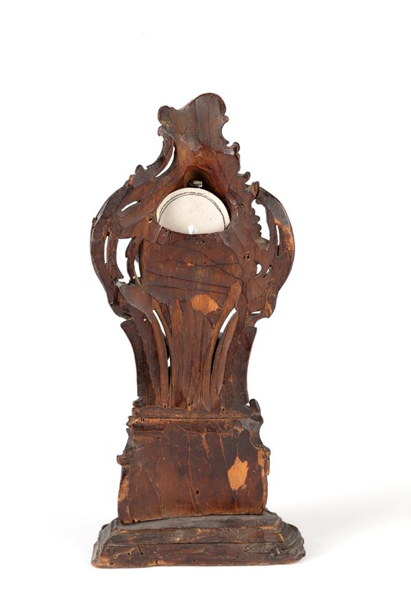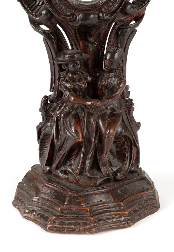 Carved and patinated wooden clock stand with an onion clock and a romantic scene at the base. 18th century. Minor defects.