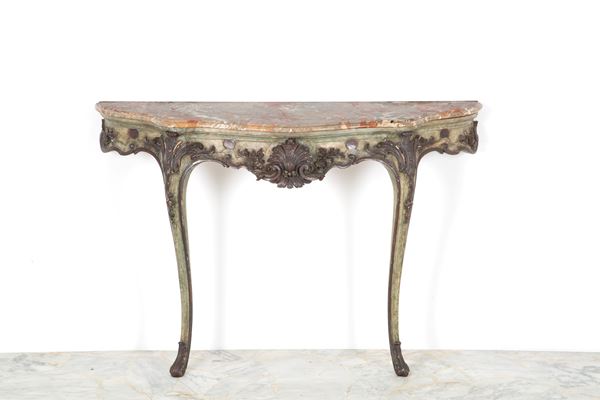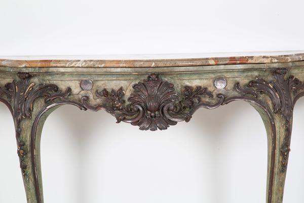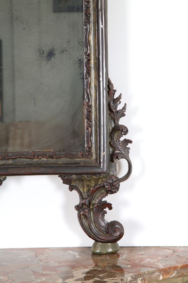 Carved and lacquered wooden console table with floral motifs, mirror and marble top. Late 19th century. Defects and missing parts.