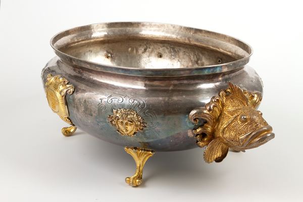 Large cachepot in silver and gold-plated metal. Produced for CIGA HOTELS. 20th century. Minor signs of wear.
