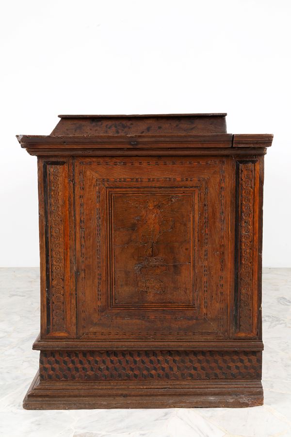 TUSCAN MASTER CABINET MAKER, LATE 15TH CENTURY. Large walnut wedding chest inlaid with cherubs, garlands, and coats of arms. Sarcophagus lid bearing the motto "Dolenti animo nil oportet credere." Defects.