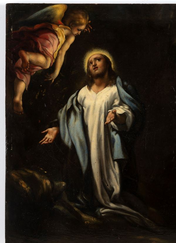 Oil on panel depicting "PRAYER IN THE GARDEN." After Correggio. 17th century. Minor restorations.
