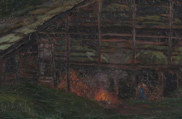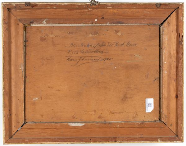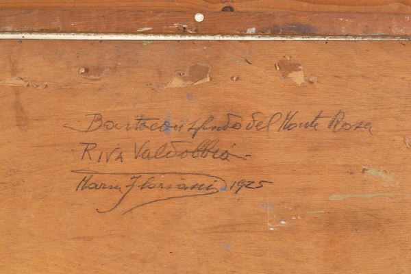 Oil painting on panel depicting "RIVA VALSABBIA." Signed lower right Maria Floriani. Countersigned and dated 1925 on the back. In a carved and gilded frame.