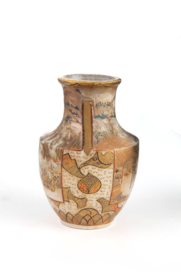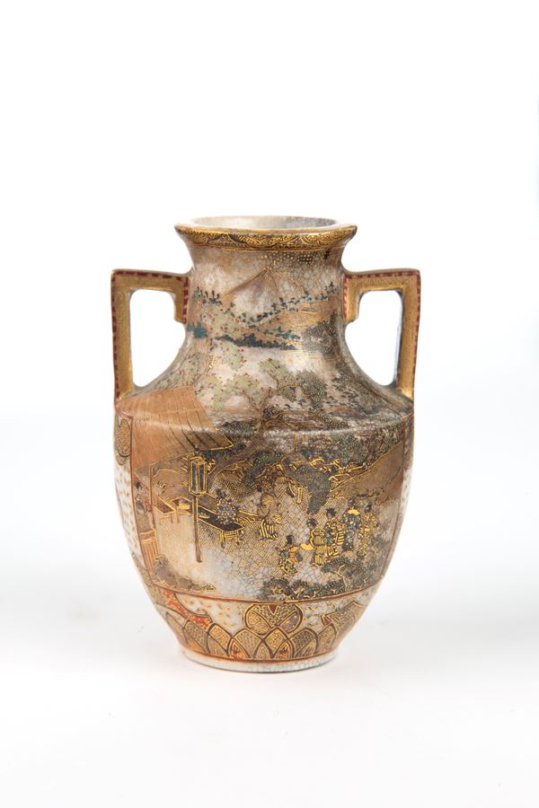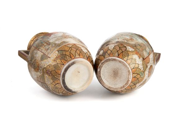 A pair of Satsuma porcelain vases decorated with floral motifs and everyday scenes. Japan.