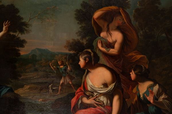 Oil on canvas depicting "DIANA WITH THE NYMPHS AND ACTEON." Framed in carved and gilded wood. Minor restorations. With attribution certificate by Prof. Dario Succi.