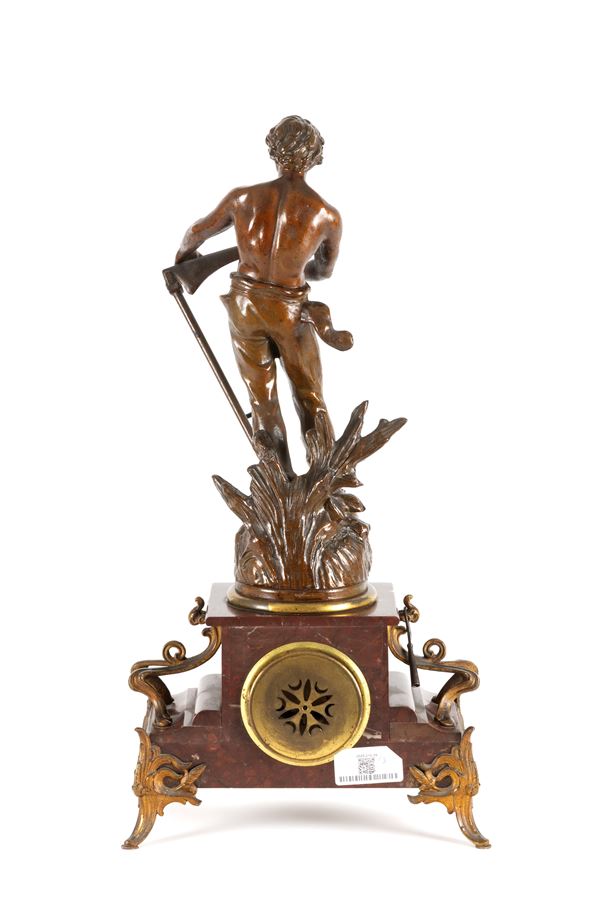 Triptych composed of a clock and two candlesticks in red and antimony marble. France. Late 19th century.