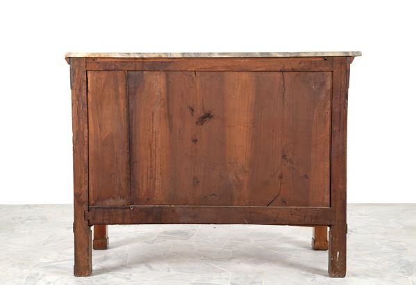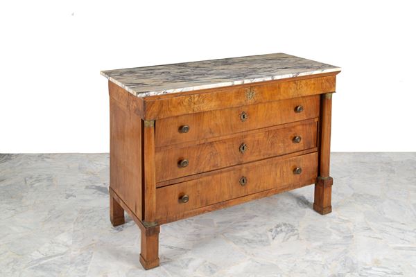 Burl veneered chest of drawers with columns, gilded bronze applications, and a marble top. 19th century. Minor defects and missing parts.