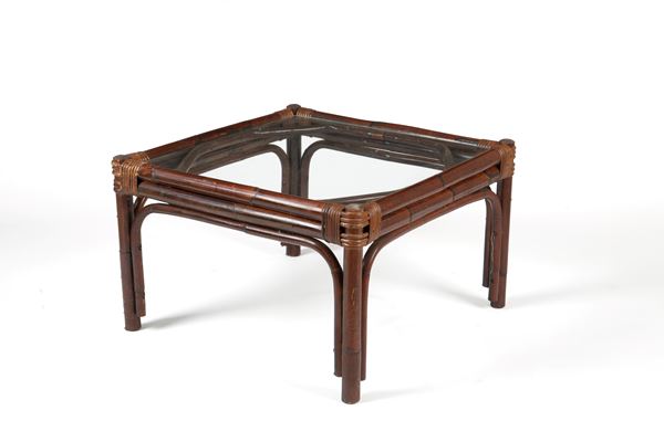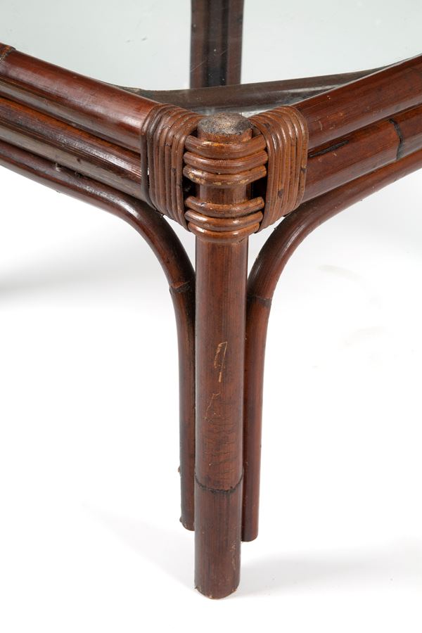 Bamboo and rattan coffee table with glass top. 1960s-70s. Shows signs of wear.