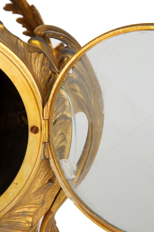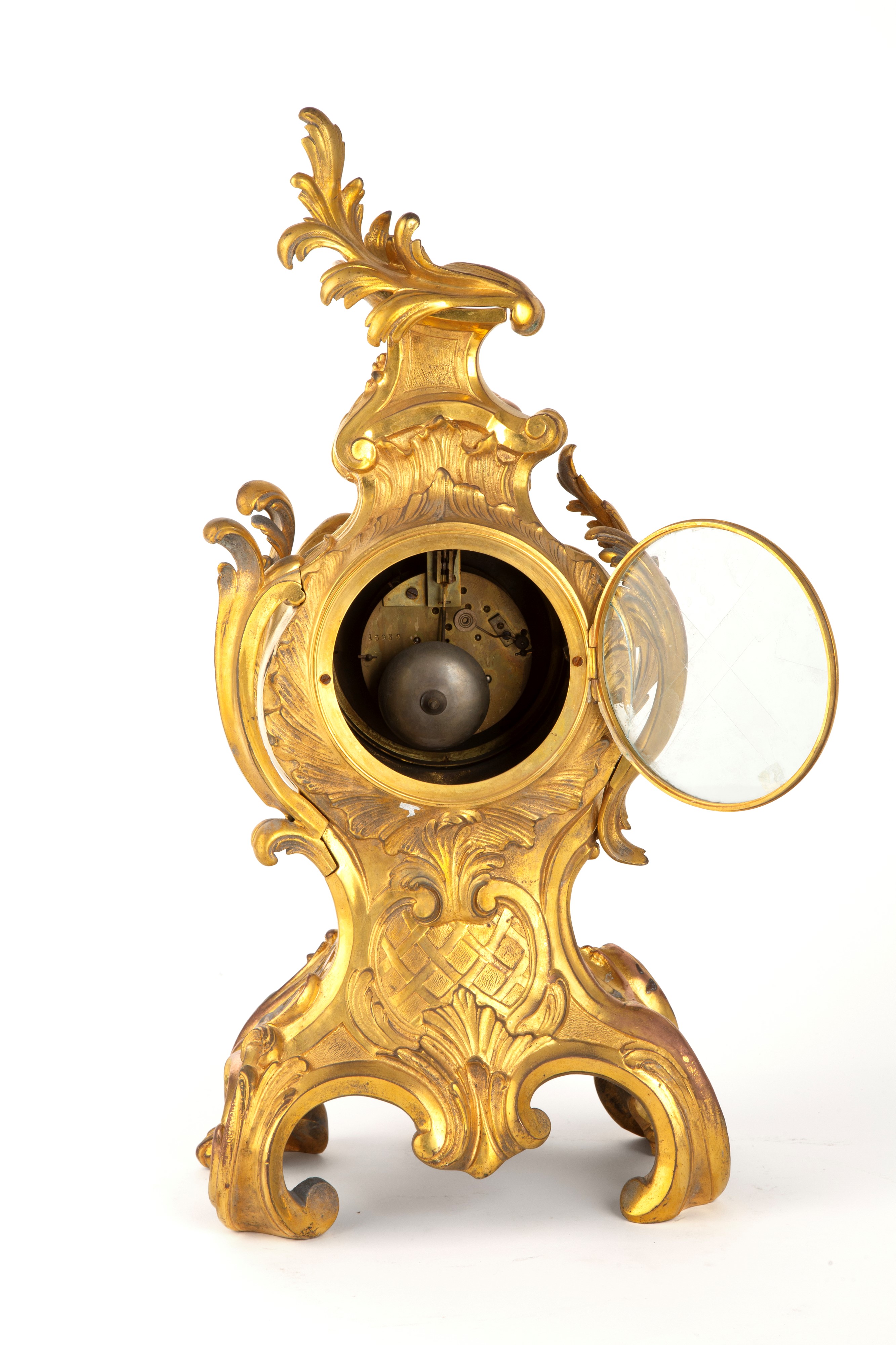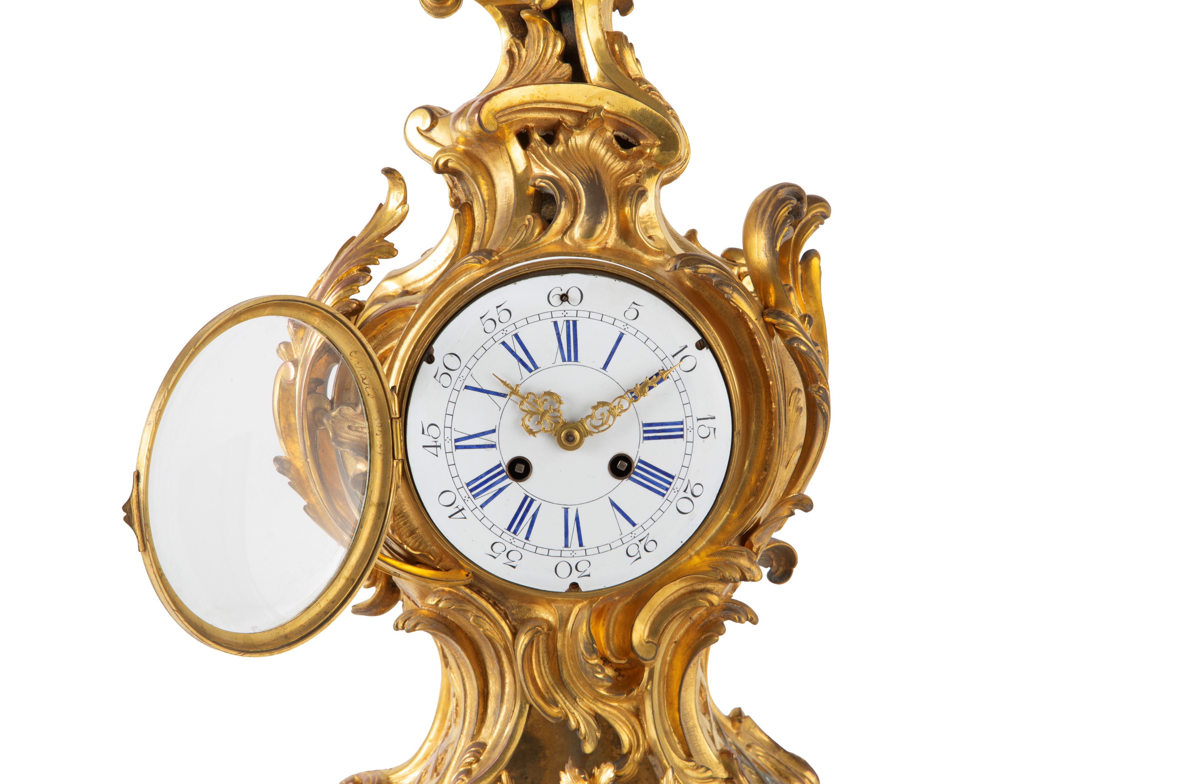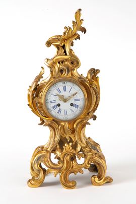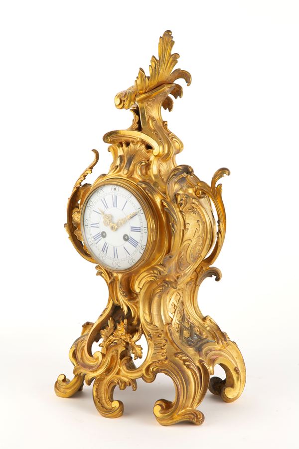 Finely chiseled and gilded bronze clock with white enamel dial. Louis XV style. Minor defects and missing pendulum.
