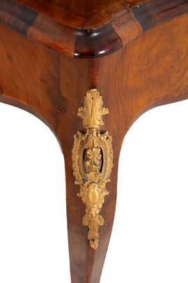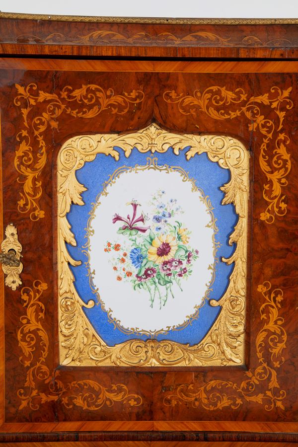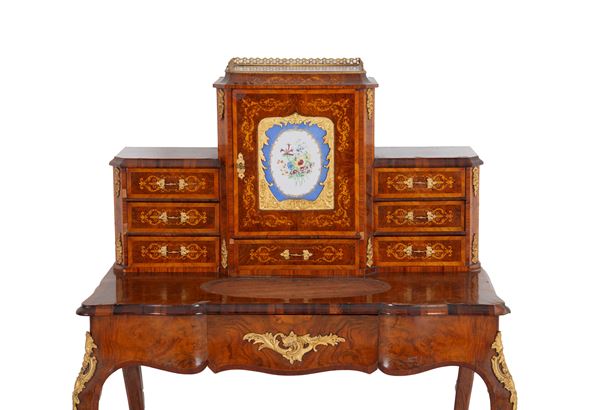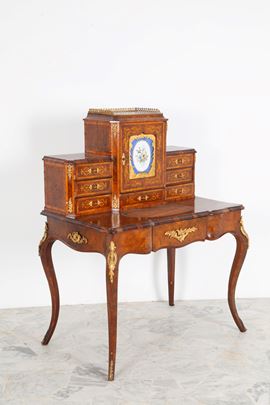 A burl and inlaid wood bureau de dame with gilt bronze trim, a Sevres plaque in the center, and a locking mechanism inside. Napoleon III period. Some defects and missing parts.