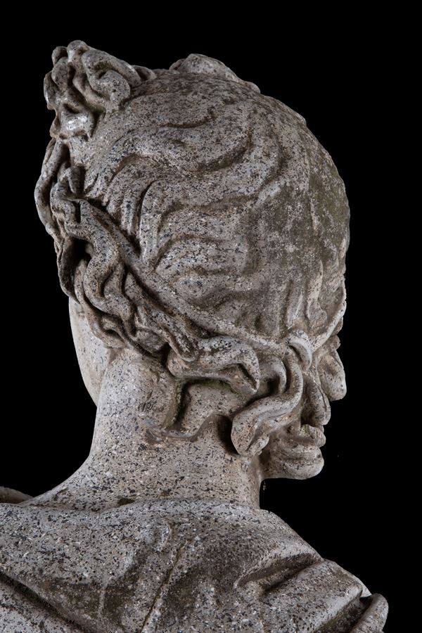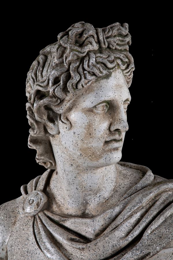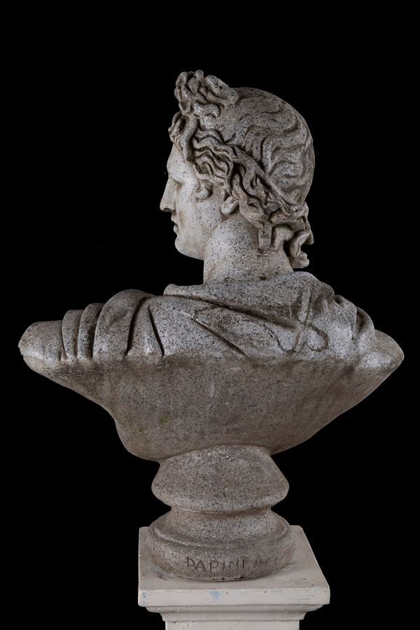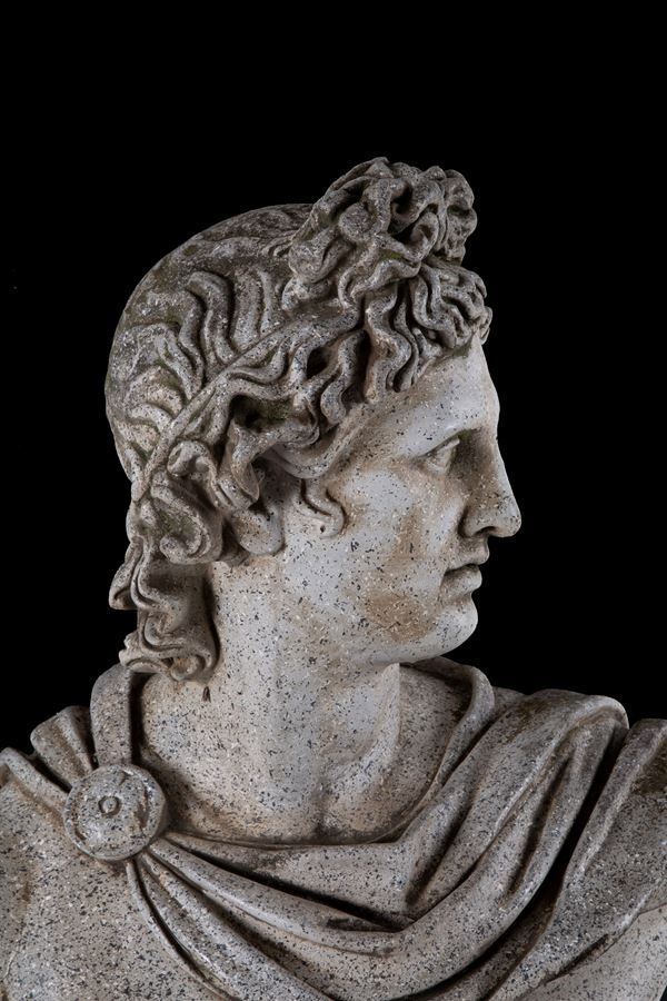 Agglomerate stone bust depicting "APOLLO DEL BELVEDERE". 20th century.