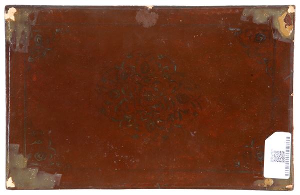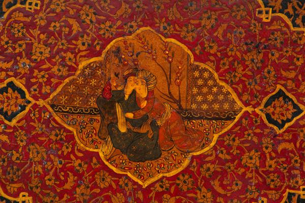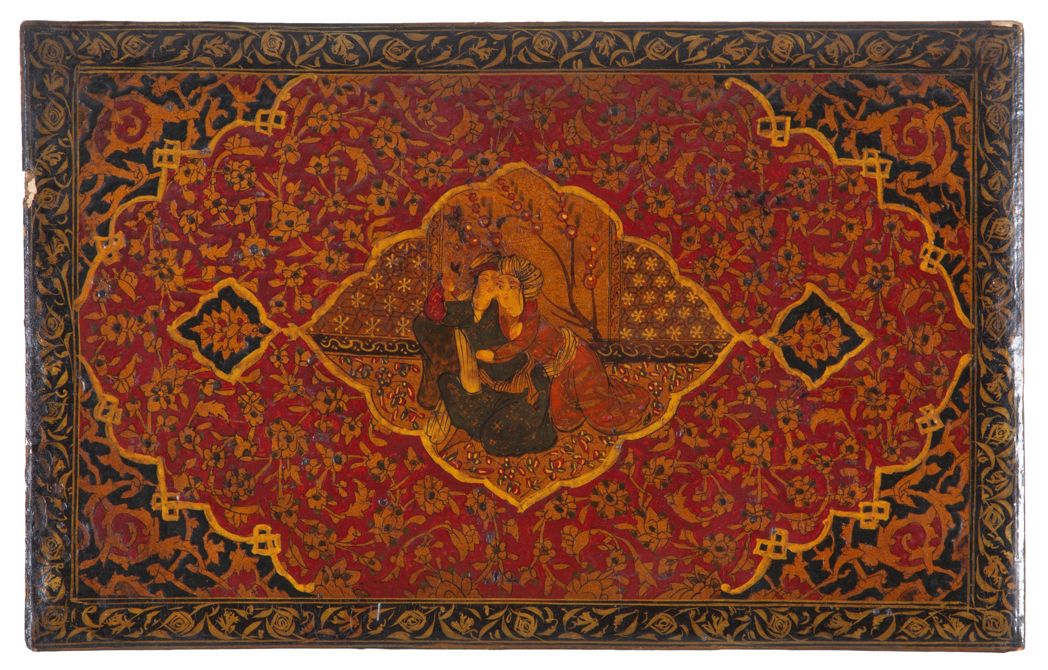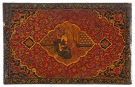 Cardboard and leather cover painted with scenes of Persian life. 19th century. Defects.