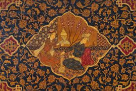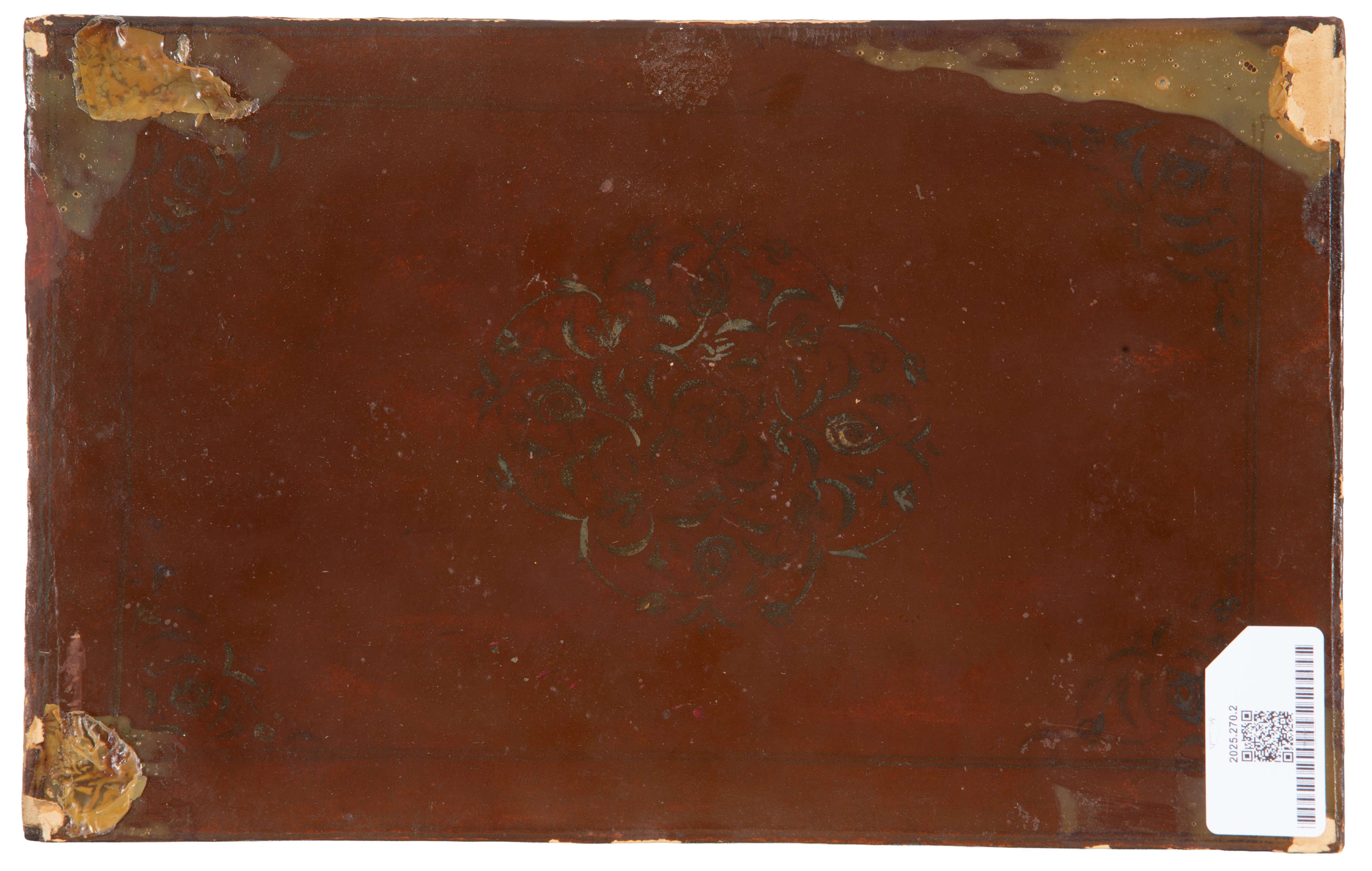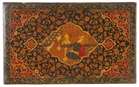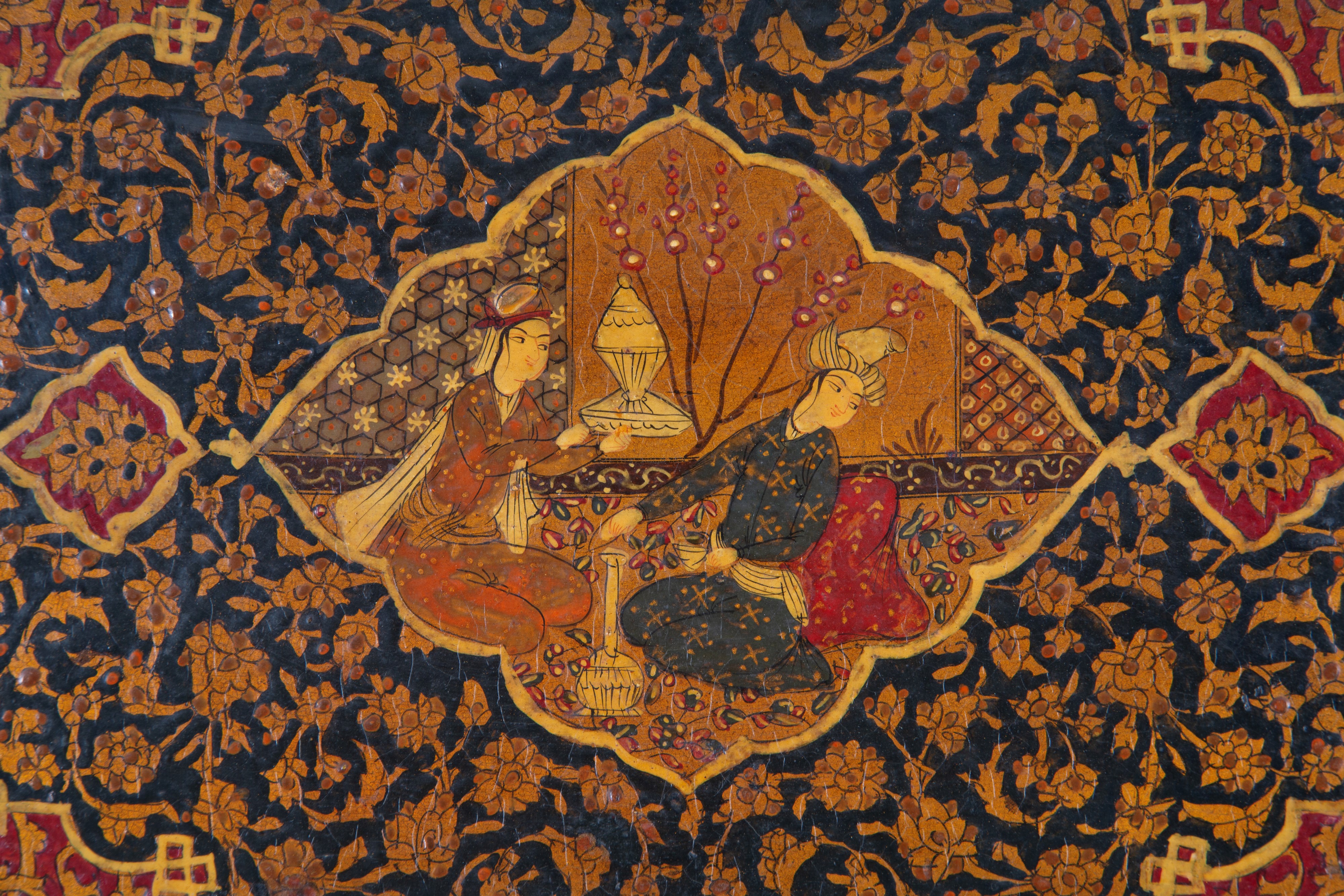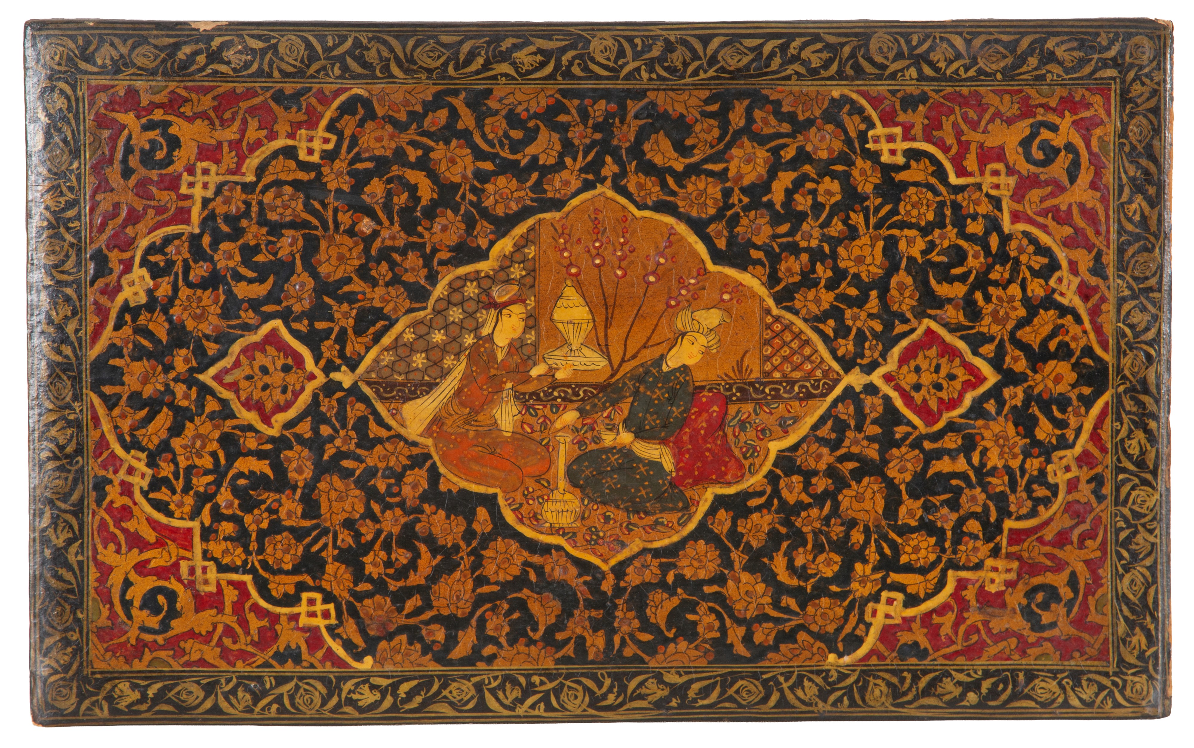 Cardboard and leather cover painted with scenes of Persian life. 19th century. Defects.