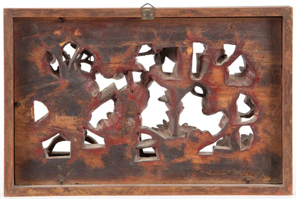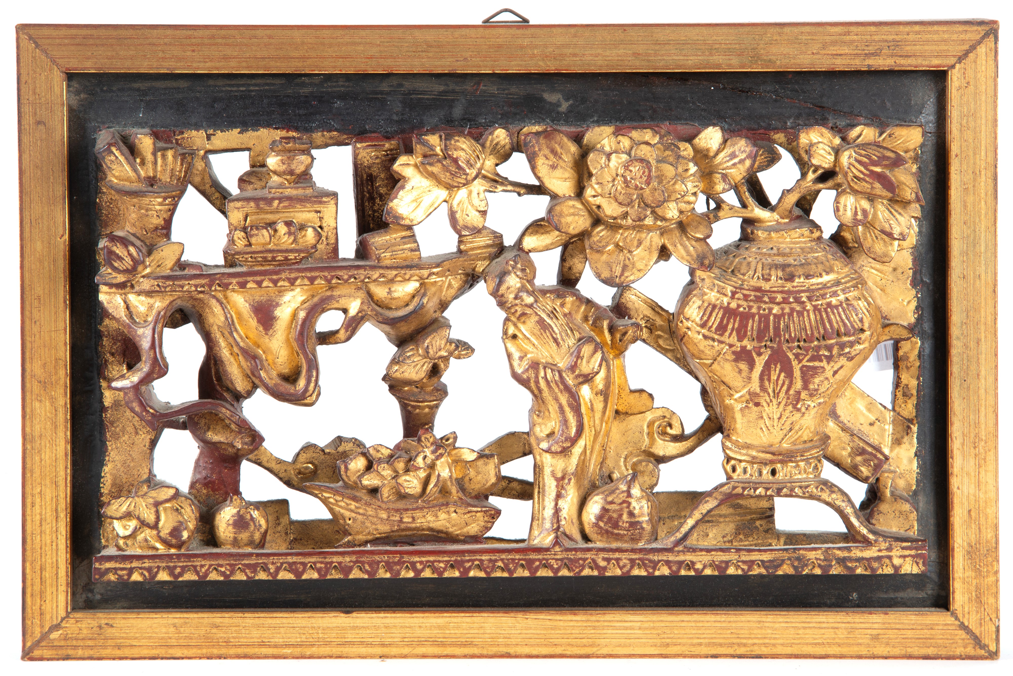 Carved and gilded wooden plaque depicting "ORIENTAL SCENES OF LIFE". China. 20th century.
