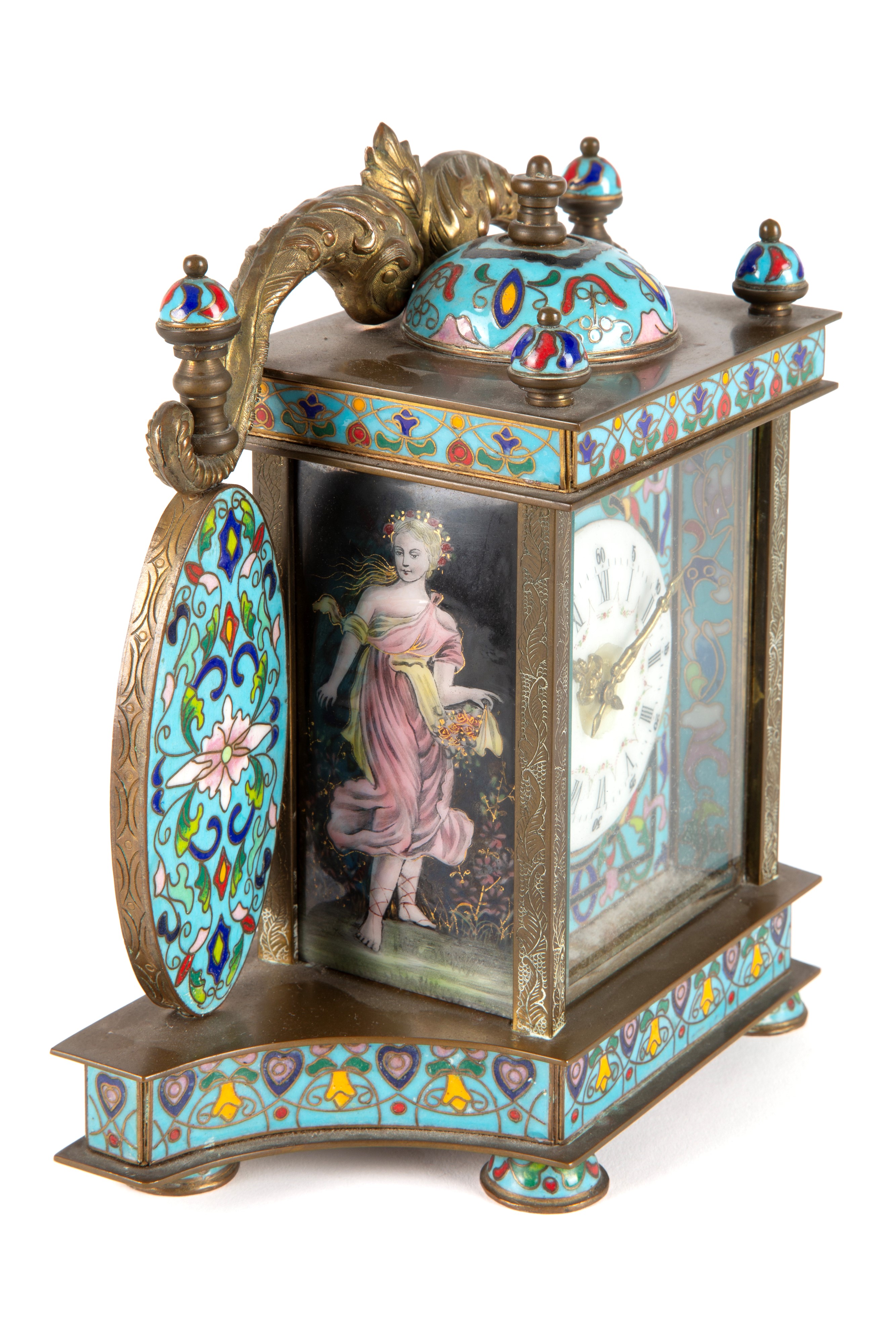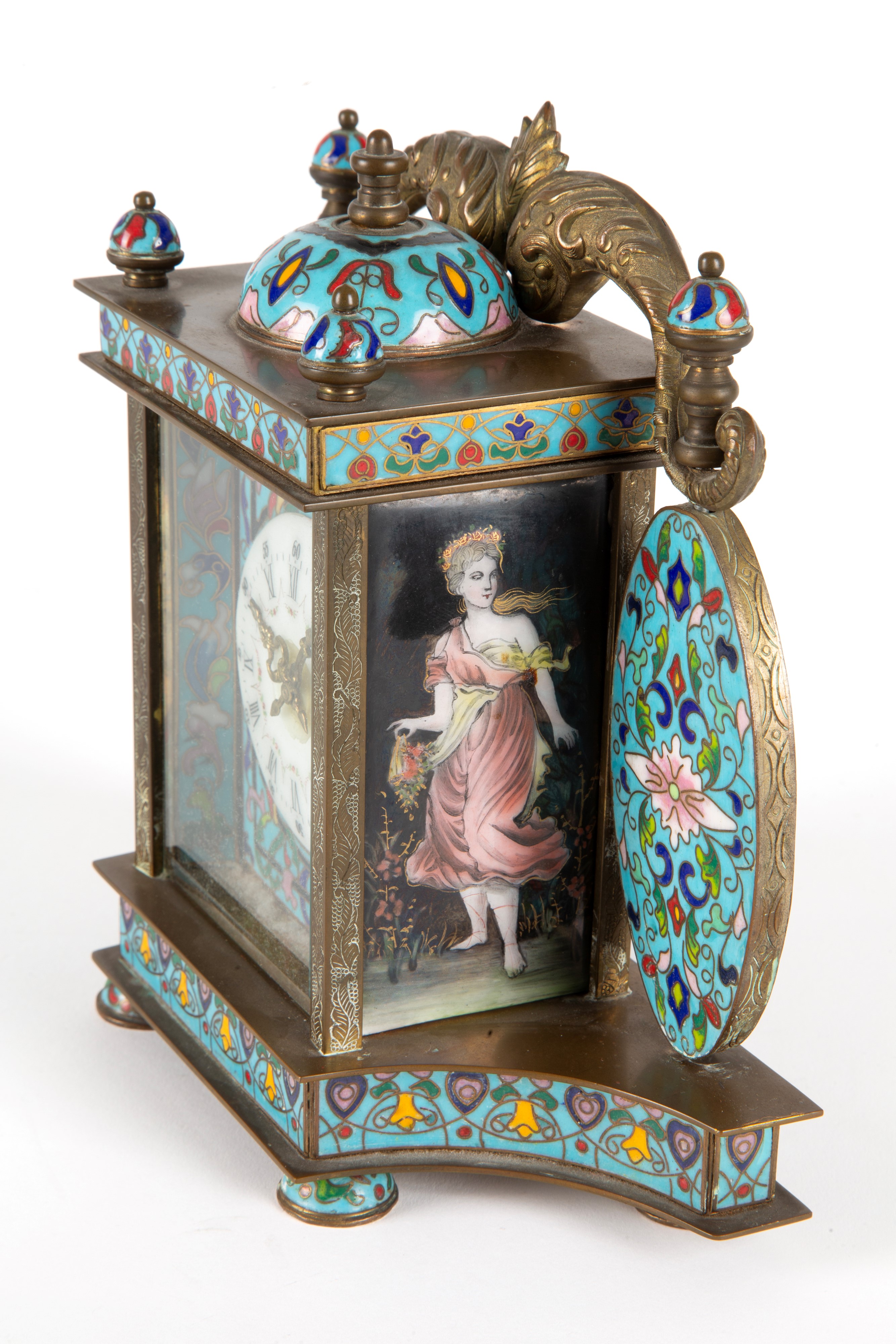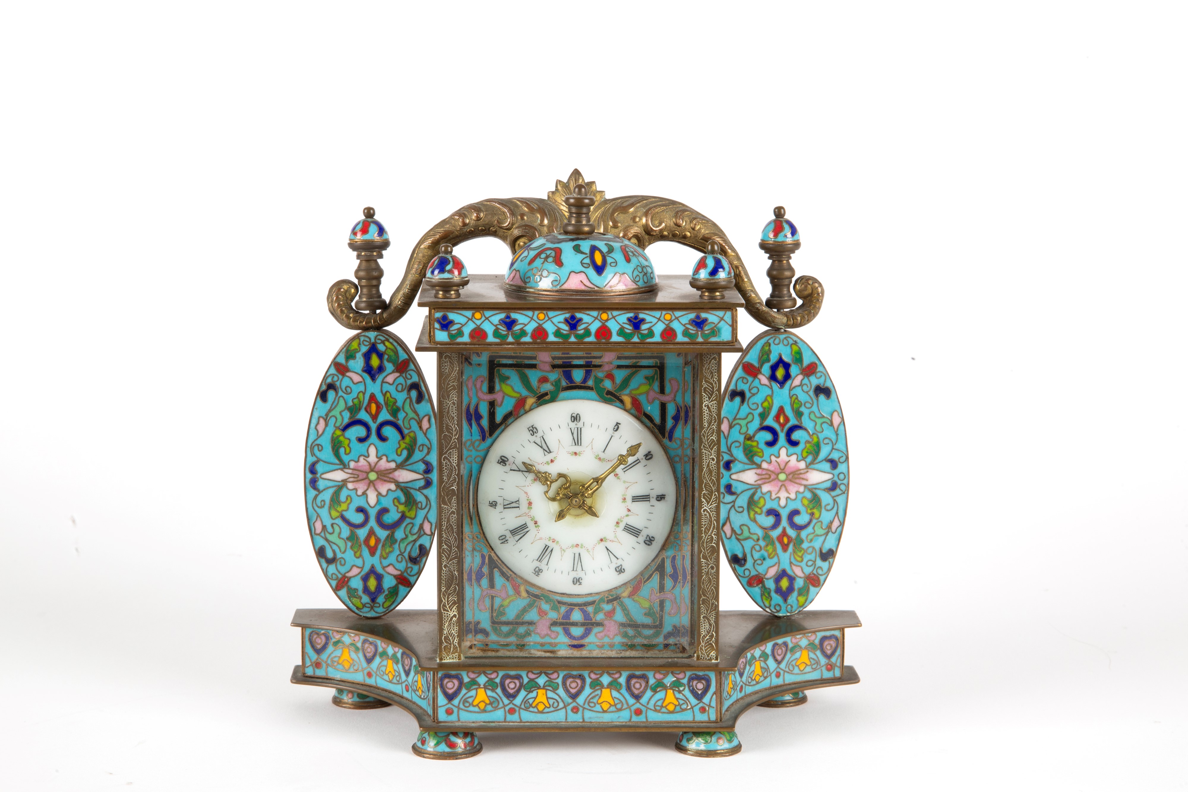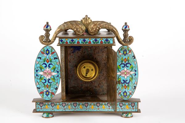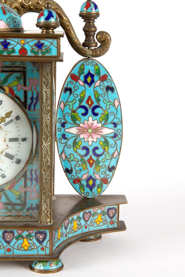 Cloisonné table clock. White enamel dial with Roman and Arabic numerals. 20th century. Minor defects.